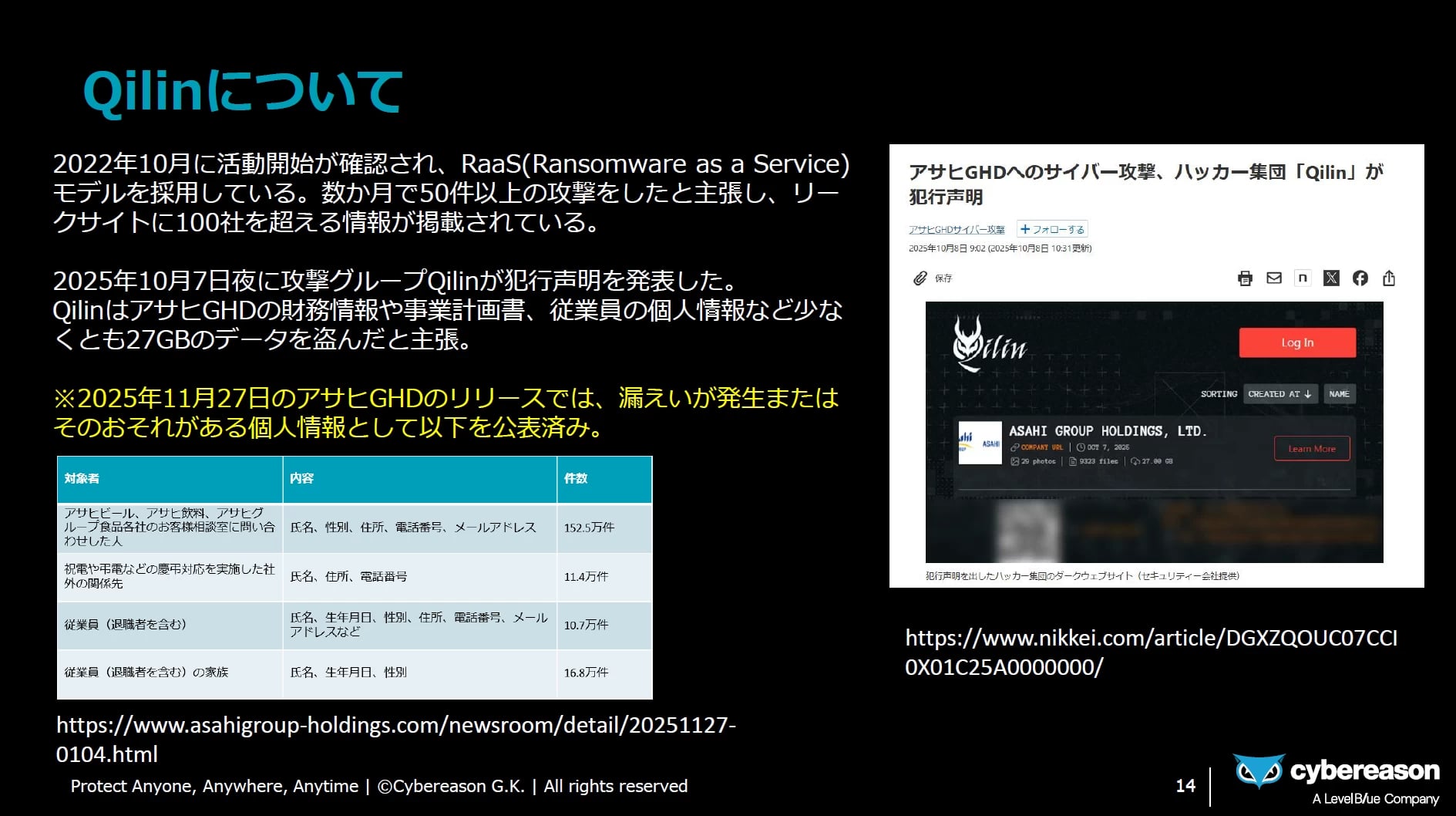 今回の事件に大きく関わっているのが、RaaSモデルを採用している攻撃グループ「Qilin」。令和7年10月7日夜に犯行声明を発表し、財務情報や事業計画書、従業員の個人情報など少なくとも27GBのデータを盗んだと主張しています。