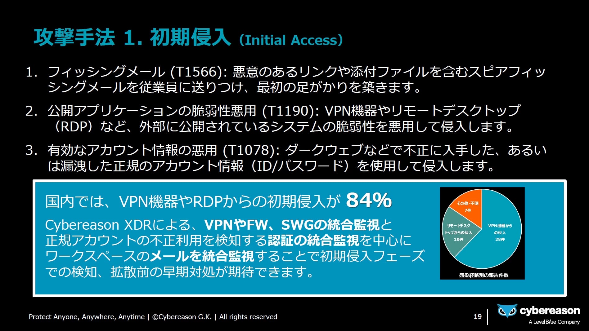 さらに感染経路を見ると、VPN機器経由とリモートデスクトップ(RDP)経由の侵入が84%を占めています。侵入の入口は、外部に公開したリモート接続やネットワーク機器に集中しています。