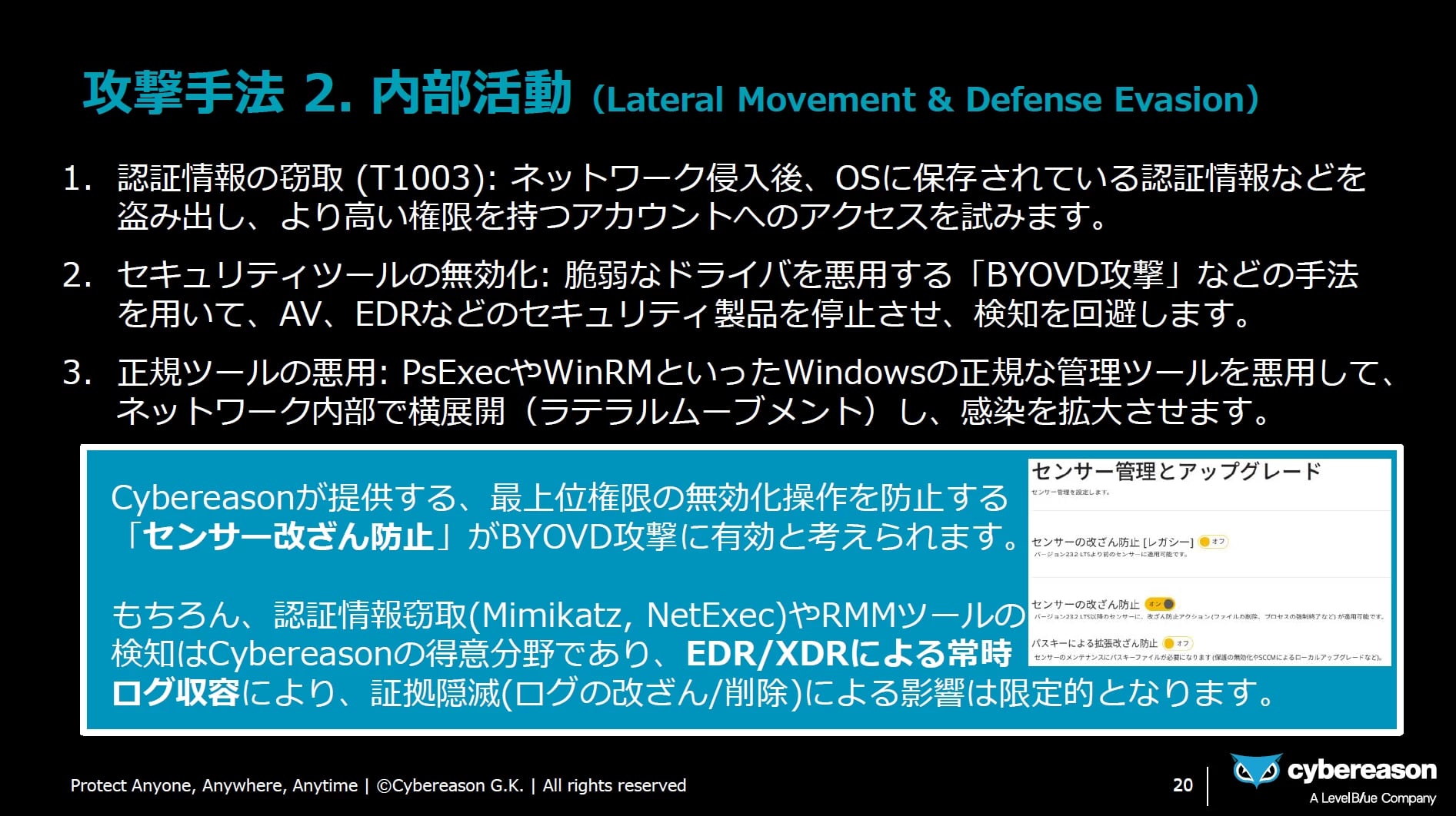 初期侵入に成功すると、内部活動に移ります。特に、脆弱なドライバを悪用してAVやEDRを止める「BYOVD攻撃」のように、検知回避をねらう動きが問題になります。