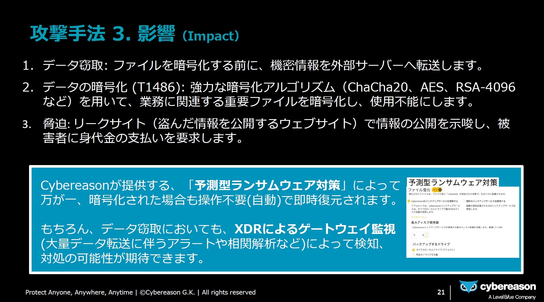 A:早期の業務復旧や事業継続という意味では有効だと考えています。ただし、攻撃者は暗号化の前にデータを盗むケースが多く、さらに暗号化実行前にバックアップデータ自体を削除・破壊する行為もよく見られます。バックアップだけで対策が十分とは言い切れないため、初期侵入や横展開、権限昇格といった早い段階でEDRなどを使って検知することが重要だと思っています。