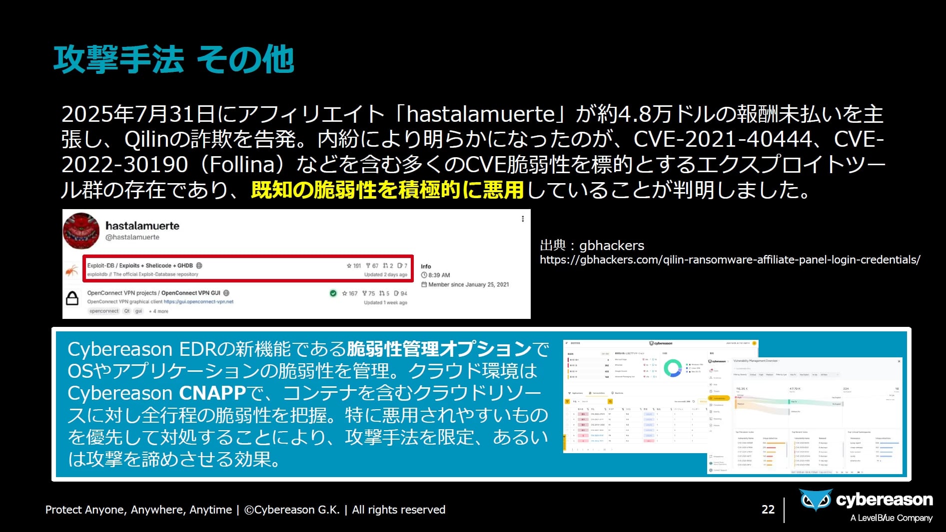 その他の動きとして、2025年7月31日にアフィリエイトが報酬未払いを主張してQilinを告発し、内紛で情報が出た結果、多数のCVE脆弱性を標的とするエクスプロイトツール群の存在が明らかになった、という話もあります。ここから分かるのは、既知脆弱性を積極的に悪用するという点で、脆弱性管理が重要になるということです。