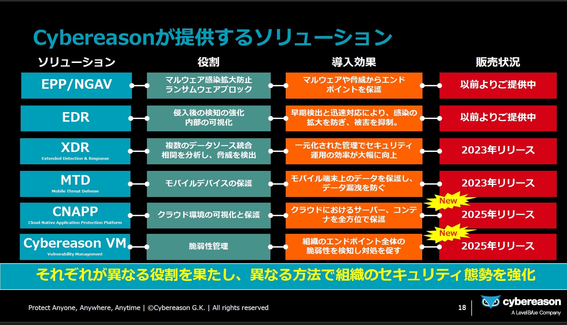 このように、既知の脆弱性を使った攻撃を防ぐには、脆弱性管理が重要です。そのために、エンドポイントだけでなく、ファイアウォールやゲートウェイ、クラウドサービスなど複数のデータソースを統合し、相関分析で脅威を検出する考え方が欠かせません。サイバーリーズンが提供しているソリューションはそれぞれが異なる役割を果たし、異なる方法で組織のセキュリティ態勢を強化しているのが特徴です。