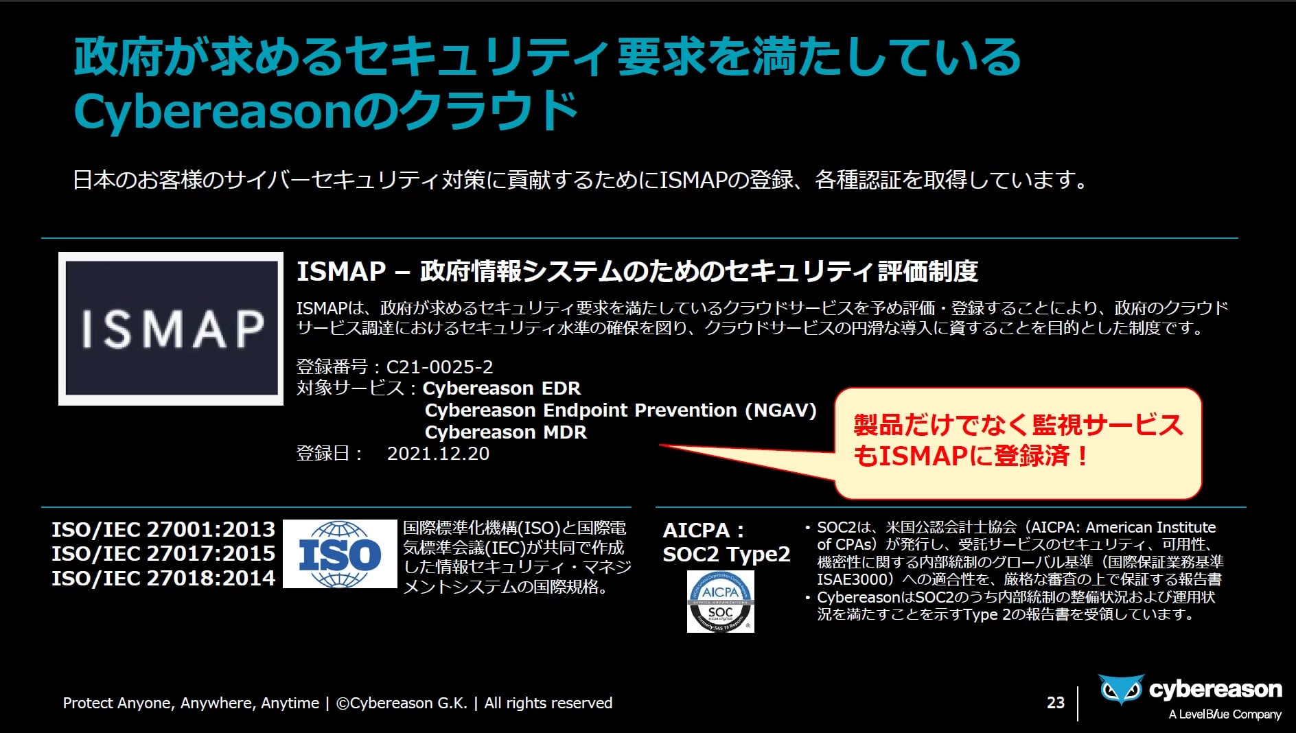 また、サイバーリーズンのソリューションはISMAPに登録されていることはもちろん、ISO/IEC 27001/27017/27018、SOC2 Type2などの認証も取得していますので、安心してお使いいただけるかと思います。
