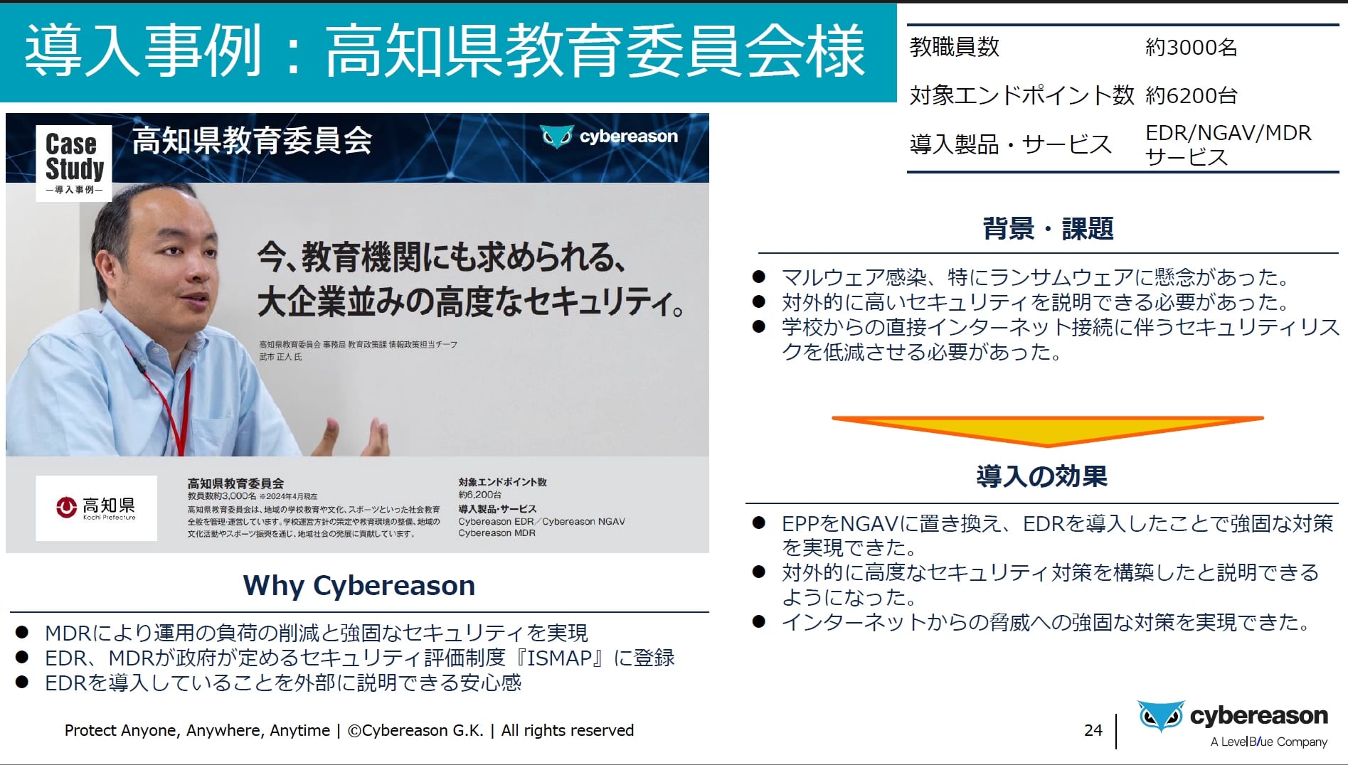 実際に、高知県教育委員会で導入していただいています。マルウェア感染、特にランサムウェアへの懸念、対外的に高いセキュリティを説明できる必要性、学校からの直接インターネット接続に伴うリスク低減といったものが背景にあったため、EPPをNGAVへ置き換え、EDRを導入して強固な対策を実現し、MDRで運用負荷の削減も図りました。