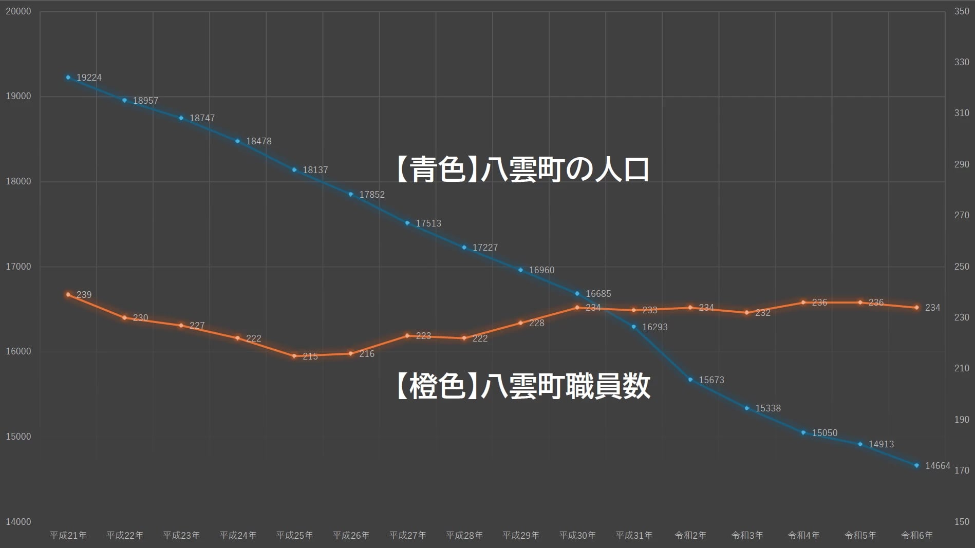 こちらは、八雲町の人口と職員数を並べたグラフです。青が人口、橙が職員数です。