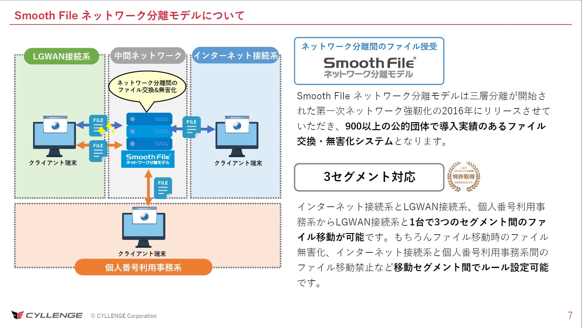 これに対し、弊社は、ネットワーク分離環境でのファイル授受のために「Smooth File ネットワーク分離モデル」を提供しています。これは三層分離が開始された第一次ネットワーク強靭化の2016年にリリースし、900以上の公的団体で導入実績があるファイル交換・無害化システムです。