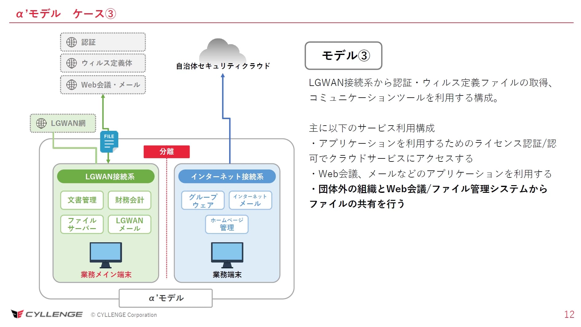 α′モデルのケース①は、LGWAN系からクラウドへは、認証やライセンス認可、ウイルス定義ファイル取得など、最低限の用途でアクセスする構成です。Web会議やメールなどのクラウドアプリは利用しない前提です。