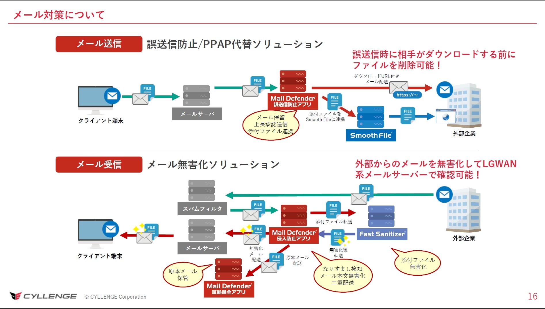 弊社は複数製品の組み合わせで、主に「ファイル授受」「メール」「その他(無害化)」の3領域で提案しています。ファイル授受では、ネットワーク分離環境でのファイル交換に加え、外部組織との大容量ファイル転送・共有を組み合わせることで、LGWAN系から外部組織とファイル授受を行います。
