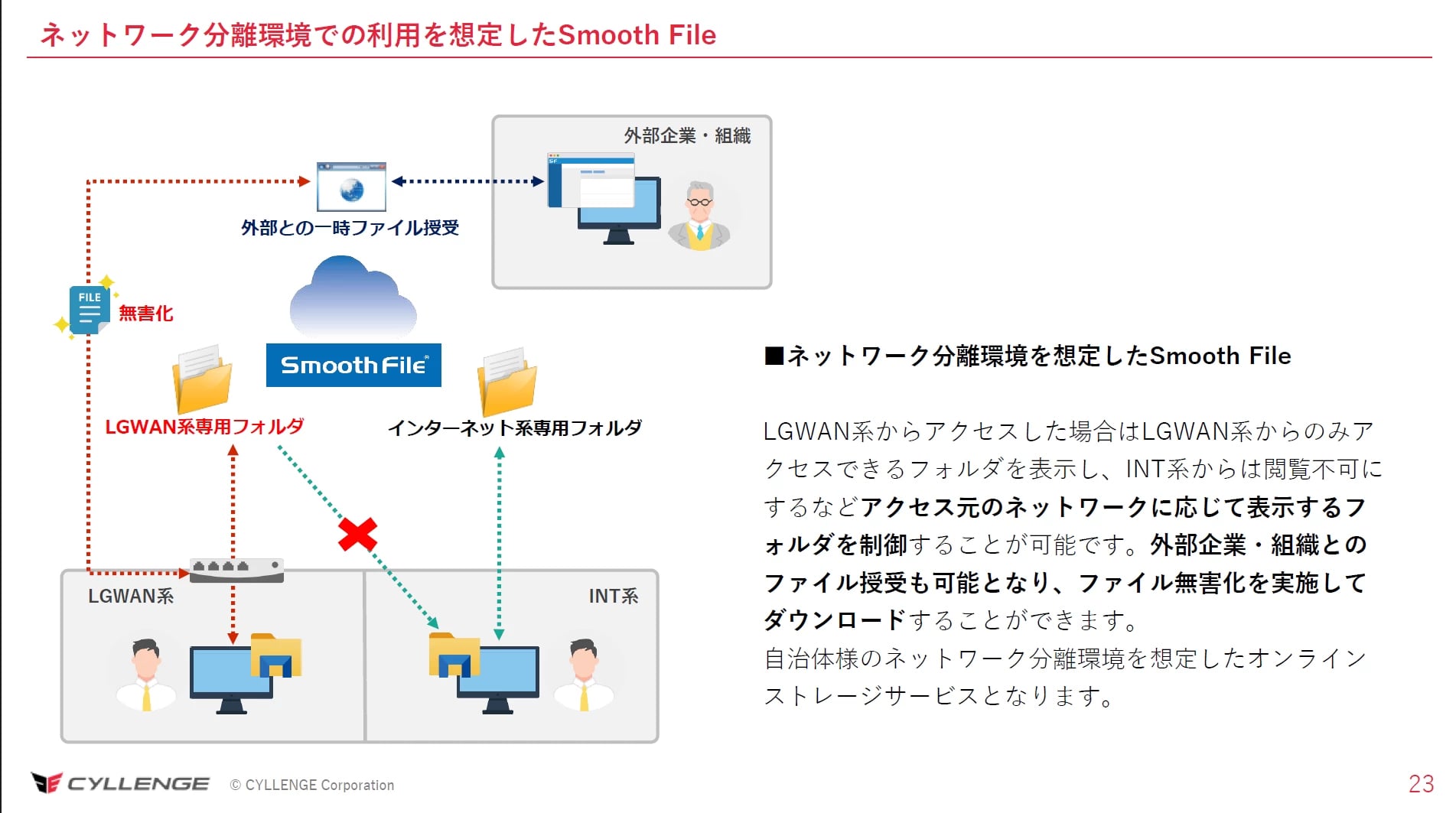 ここに対して、弊社のSmooth Fileはアクセス元ネットワークに応じて表示するフォルダを制御でき、LGWAN系からはLGWAN系専用フォルダのみ、インターネット系からはインターネット系専用フォルダのみを表示するといった使い分けが可能です。外部企業・組織とのファイル授受も想定し、ダウンロード時に無害化を実施します。