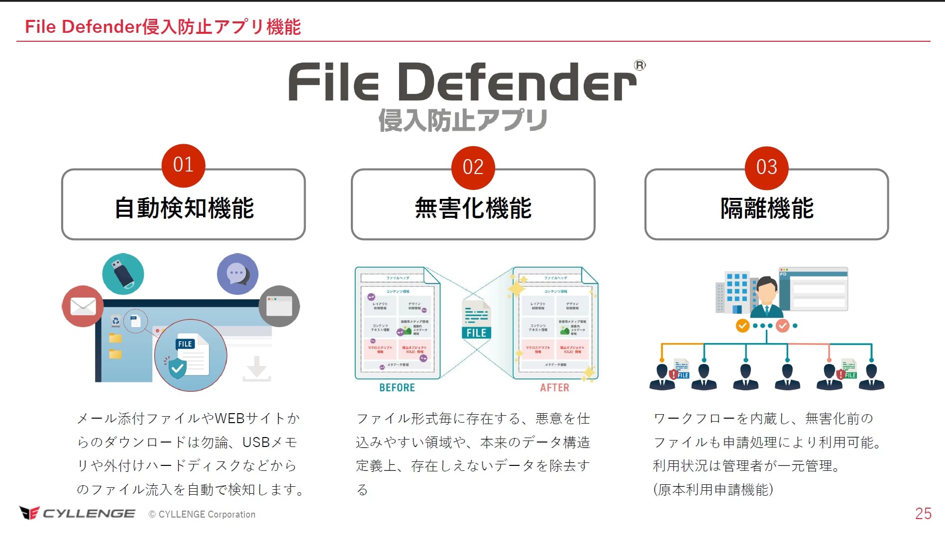 β・β′モデルではインターネット系端末がメインになるため、端末側でファイル流入を検知・無害化する対策も重要になります。File Defender侵入防止アプリでは、メール添付やWebダウンロード、USBなど外部媒体からのファイル流入を自動検知し、無害化し、無害化前ファイルも隔離して申請により利用できる、といった機能が備わっています。