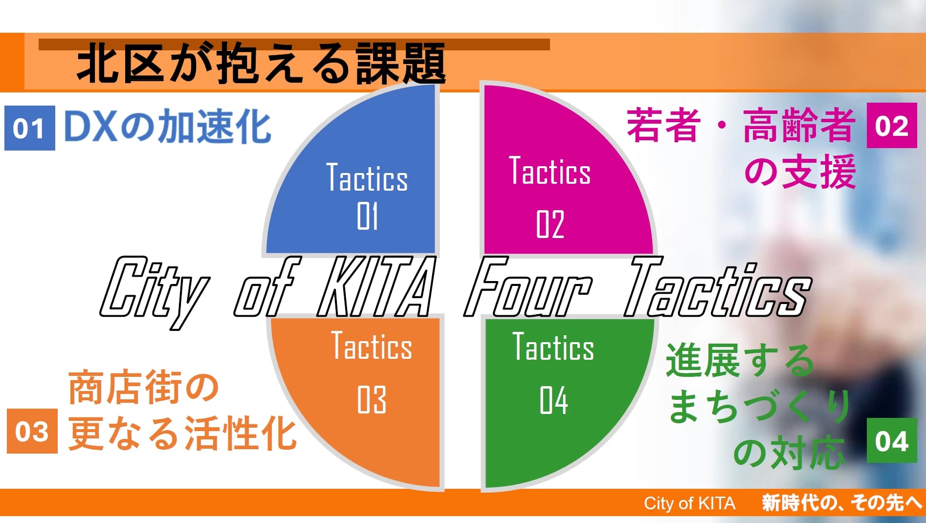 北区が抱える課題として、DX加速化、若者・高齢者支援、商店街活性化、進展するまちづくり対応の4項目があります。