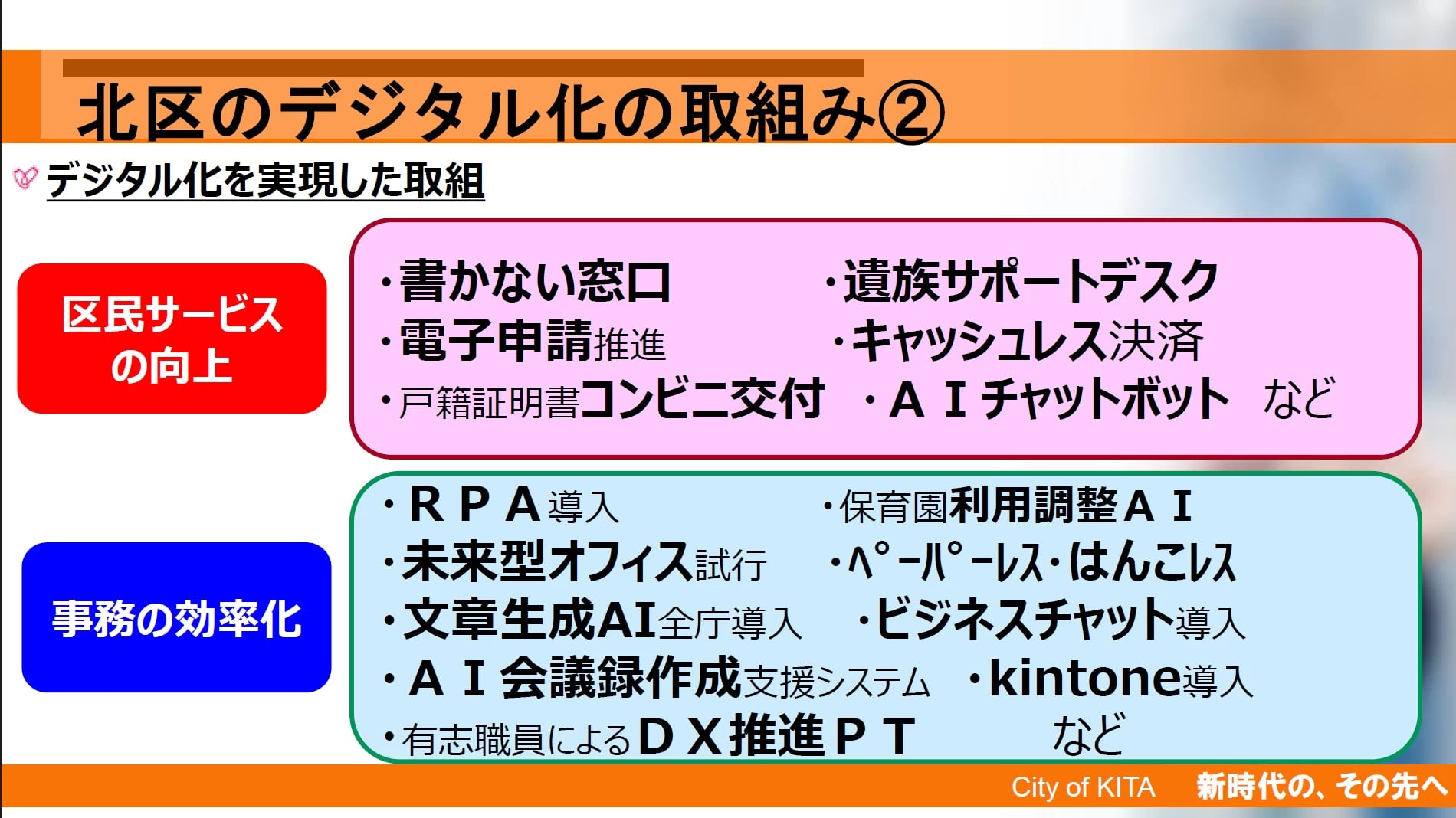 デジタル化を実現した具体的な取り組みは「区民サービスの向上」と「事務の効率化」の2点です。区民サービスの向上では、書かない窓口、遺族サポートデスク、電子申請推進、キャッシュレス決済、戸籍証明書のコンビニ交付、AIチャットボットなど。事務効率化では、RPA導入、保育園利用調整AI、未来型オフィス試行、ペーパーレス・はんこレス、文書生成AIの全庁導入、ビジネスチャット導入、AI会議録作成支援、kintone導入、有志職員のDX推進PTなどです。