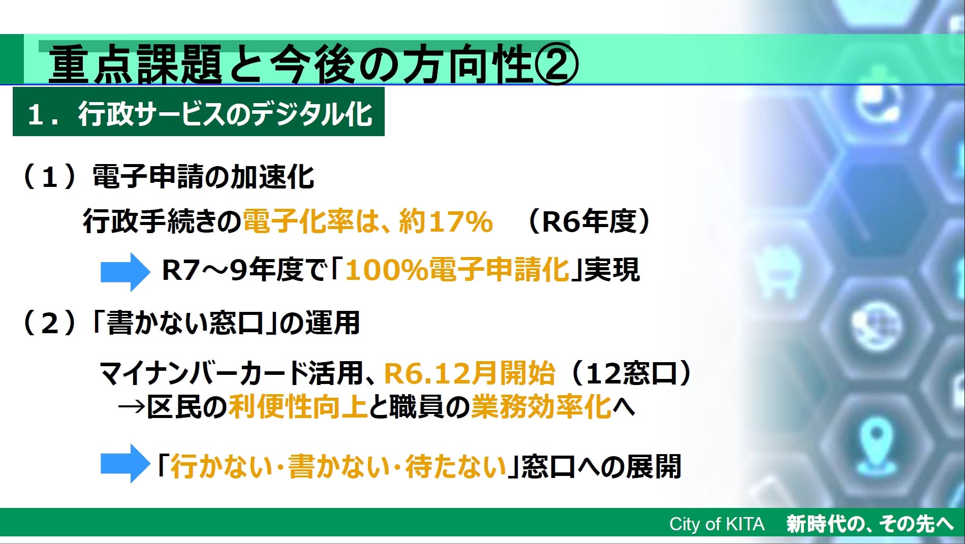 重点課題の1つ目は行政サービスのデジタル化です。行政手続きの電子化率が約17%(令和6年度)であることを踏まえ、令和7~9年度の3年間で「100%電子申請化」を実現する方針を掲げています。また「書かない窓口」は令和6年12月から12窓口で開始しており、「行かない・書かない・待たない」窓口への展開を目指したいと考えています。