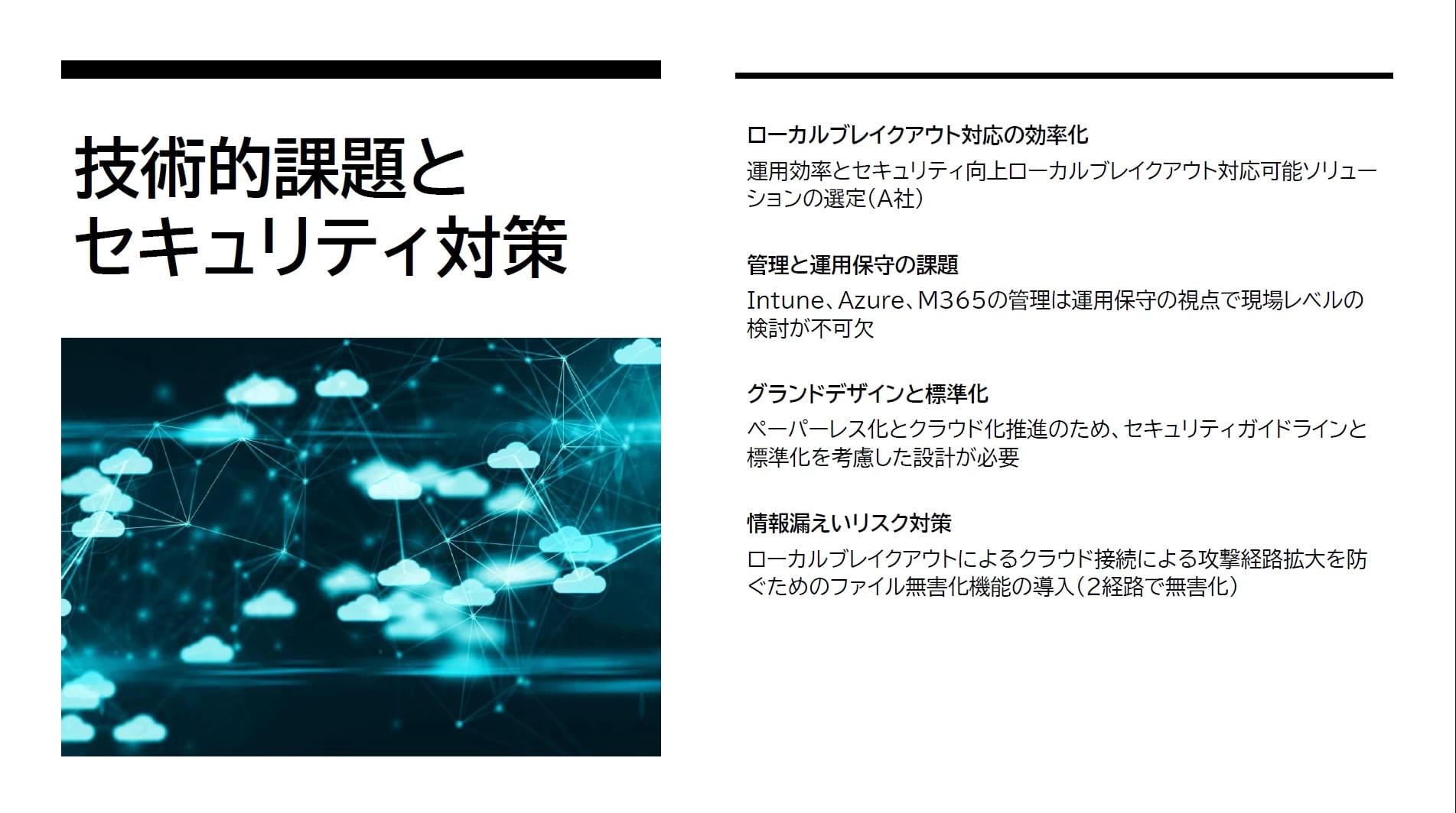 技術的課題としては、ローカルブレイクアウト対応の効率化(対応可能ソリューション選定)、Intune/Azure/M365などの管理・運用保守の課題、標準化やセキュリティガイドラインを踏まえたグランドデザイン、そしてLBOで攻撃経路が増えることを前提にした情報漏えいリスク対策(ファイル無害化機能を2経路で導入)などがあります。