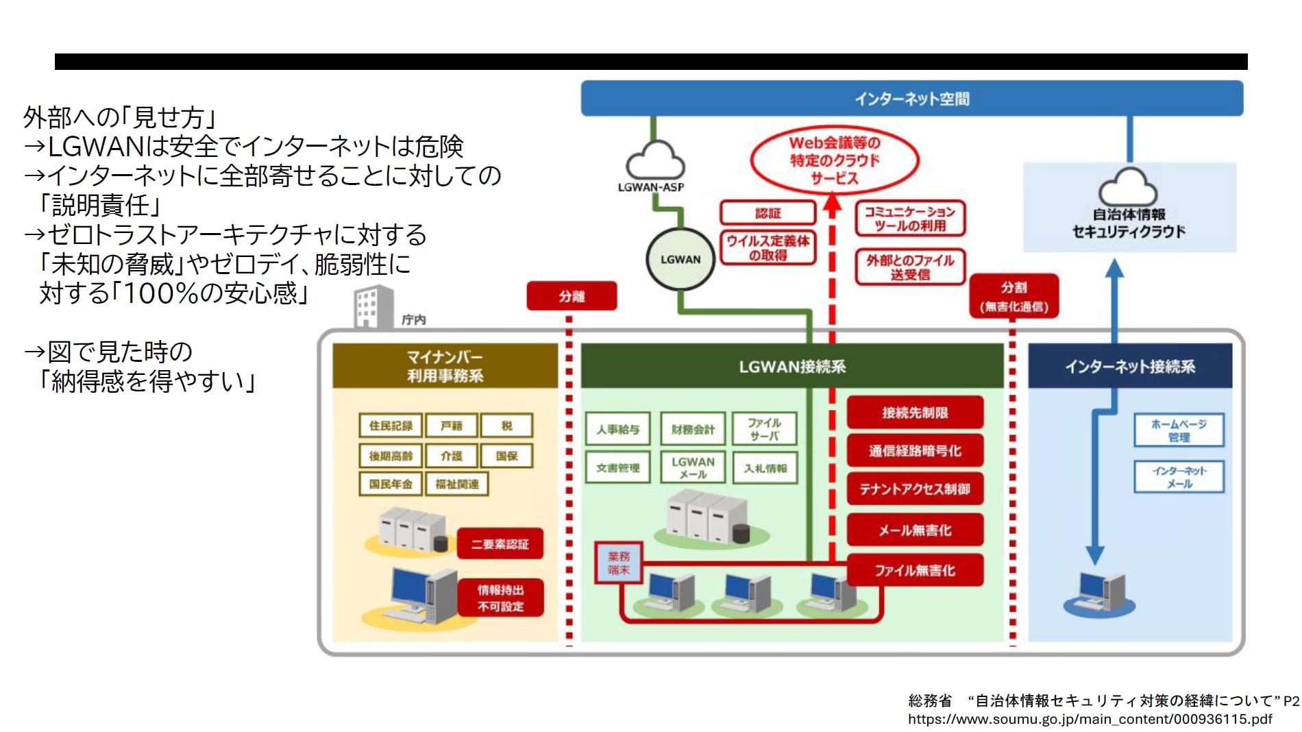 その頃、とある自治体の情報担当者が言った「住民はLGWANなんて使ってない」という言葉が、私の胸に深く刺さりました。確かにLGWANの先に住民はいません。住民はインターネットの先にいる。LGWANで業務をしているのは、事情はあるにしても行政の都合です。行政が行政の都合で、住民と違うステージにいるのはどうなんだろう――そんなことを考えるようになりました。