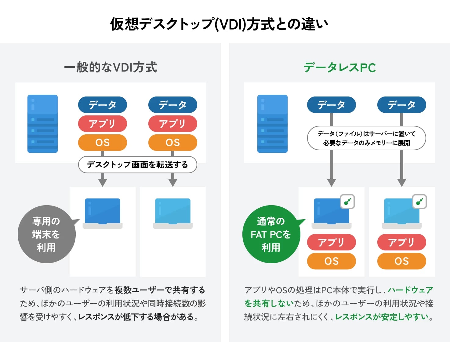 通常、VDIではデスクトップやデータをサーバーが保有し、業務端末の機能を最低限に抑えてシンクライアント化する、という手法が用いられる。これに対し、データレスPCは既存の業務端末をそのまま使いつつ、業務端末内にはOSとアプリケーションだけを残し、データはサーバー側で保有・管理するという仕組みを採用している。