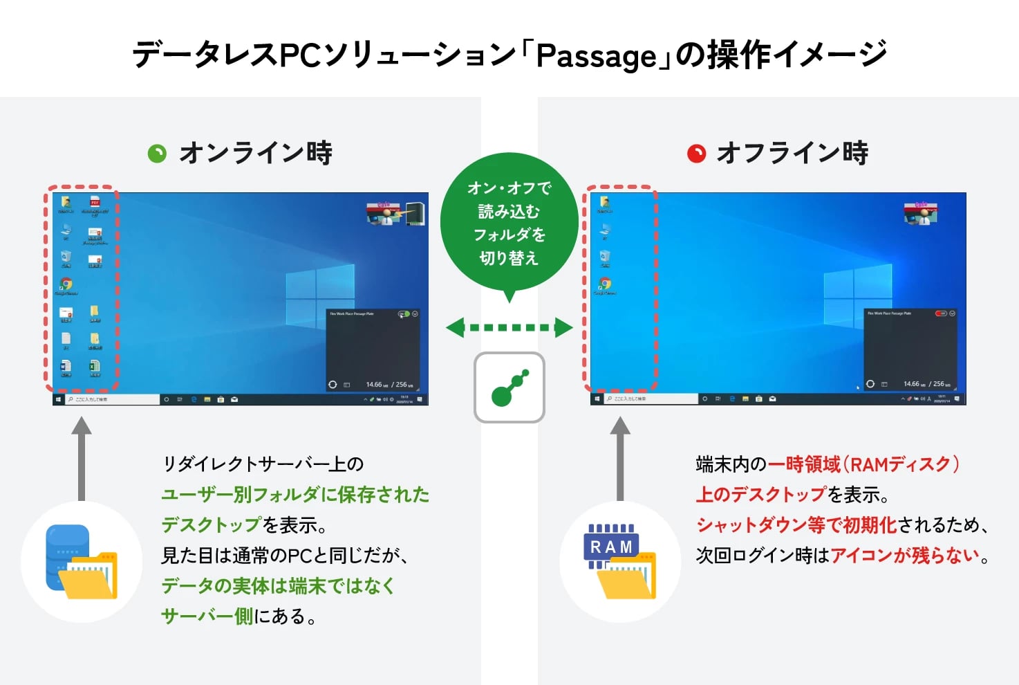 このデータレスPCには、オンプレミス対応の「Passage(パサージュ)」と、クラウド対応の「Passage Drive(パサージュ ドライブ)」という2つのソフトウェアが用意されており、自治体の希望する形態に合わせて調達できる。いずれも、業務端末のOSとアプリケーションはそのまま活用しながら、データは端末内に保存せずサーバーへ自動的にリダイレクトされる。保存先は、庁内サーバーもしくはクラウドとなる。