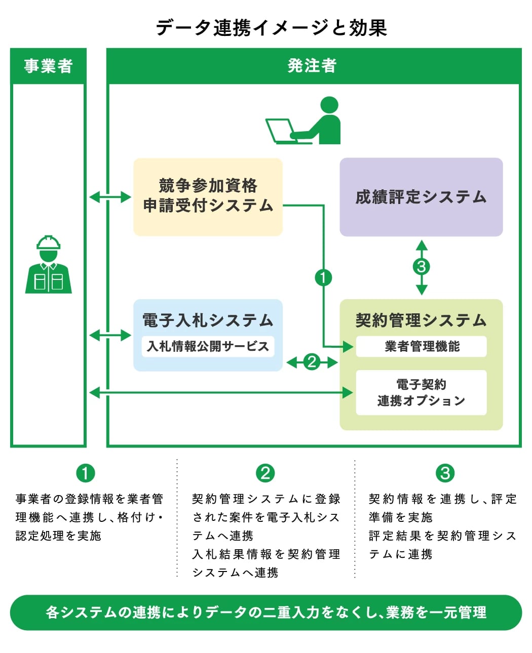 また、「契約管理システム」は業者や入札・契約関連情報をデジタルで管理し、「競争参加資格申請受付システム」は競争参加資格申請の作成・提出・受付事務を電子化。そして「成績評定システム」では評定案件の登録、施工プロセスチェックリストの入力、評定登録、 評定統合処理、評定結果通知書の出力まで一連の評定業務を標準サポートしている。
