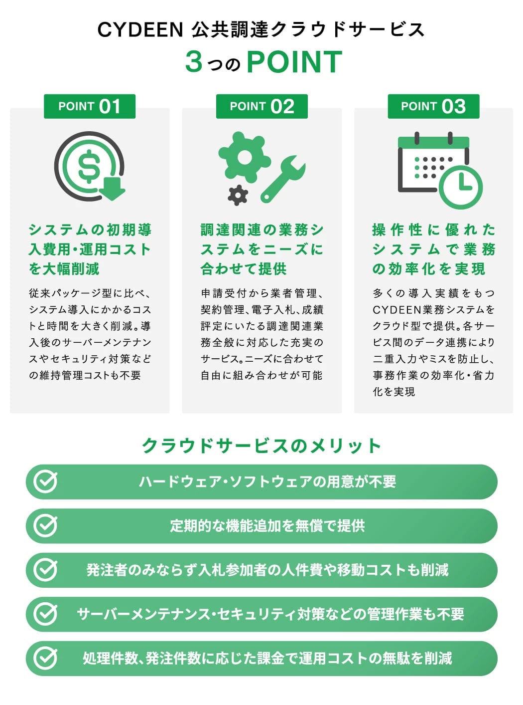 CYDEEN 公共調達クラウドサービスは、調達関連業務に特化したシステム群。4つのシステムから成り、「電子入札システム」は、紙による入札手続きを、インターネットを介した方法に変えることで一連の業務も電子的に処理できるようになる。