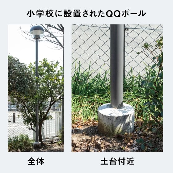 実際の導入事例として、熊本県のある小学校では、校舎脇に設置していた街路灯が腐食の進行と台風被害により倒壊した。復旧では児童の安全を考慮して平日を避け、短工期でリニューアルできるQQポールを採用。土日で工事を完了し、敷地を大きく傷めることなく、コストも抑えられたと評価されている。