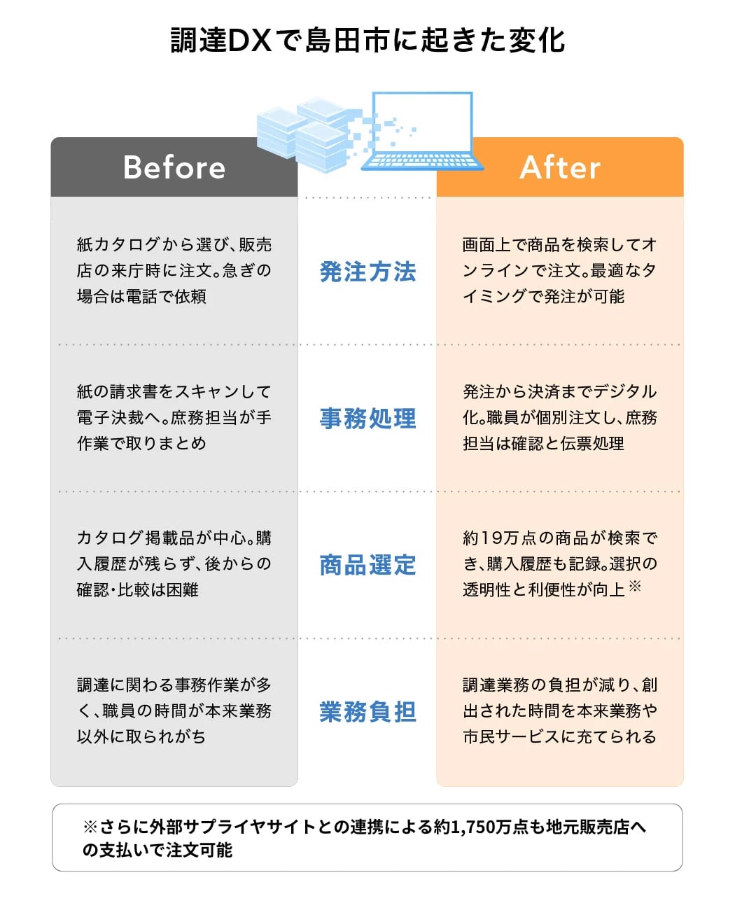 さらに、自治体側だけでなく、地元事業者側のメリットも大きいと柿本さんは付け加える。「従来は、販売店の方が来庁して注文をとったり、商品を配達したり、請求書を届けたりしていました。そうした手間が軽減され、特に出先機関に行く手間が軽減されたのが喜ばれています。もちろん出先機関の職員も、好きなタイミングで発注できる。双方にとってメリットの大きいシステムだと思います」。