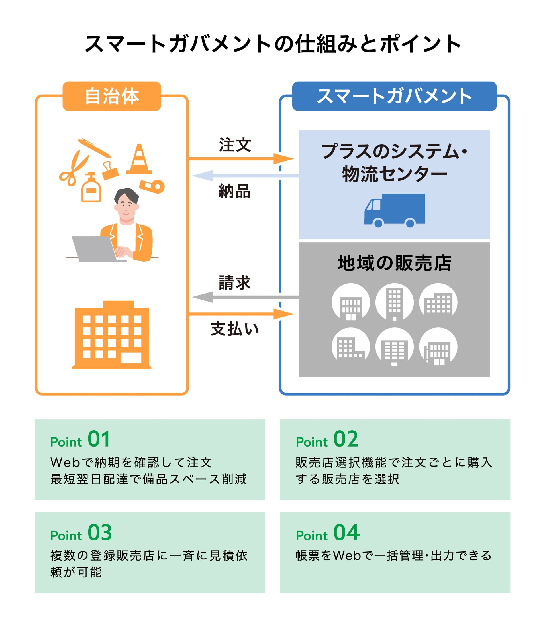 そうした中、同市に事務用品などを納品している地元の販売店から「便利なシステムがある」という話を聞いた。そこで紹介されたのが、「プラス」が提供している「スマートガバメント」だった。