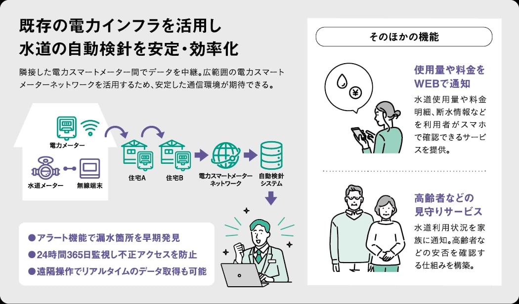 電力検針の仕組みを共同利用して水道の使用量を遠隔で確認する。
