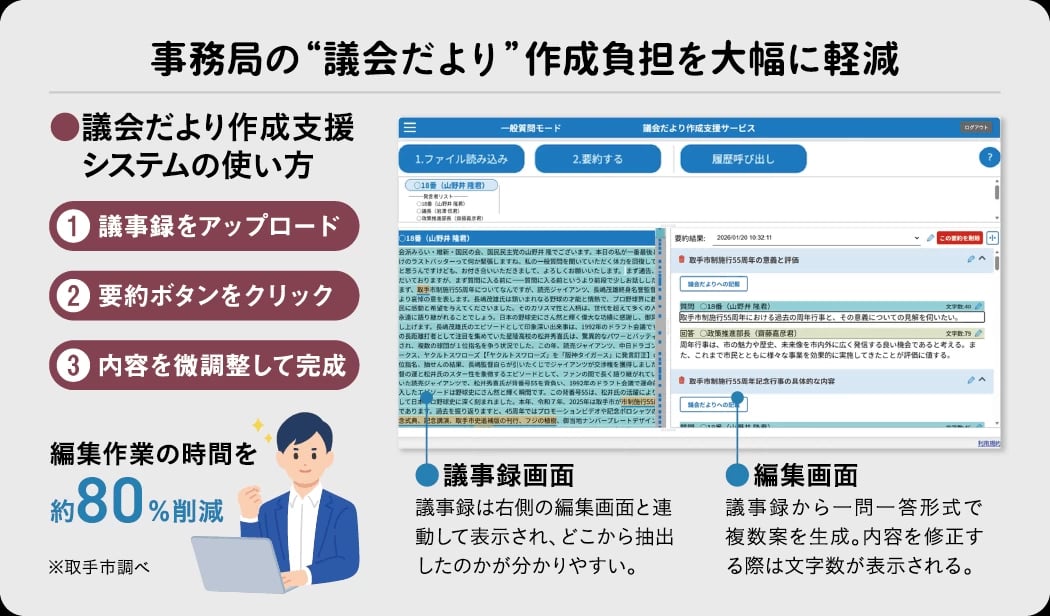 同市では以前から「アドバンスト・メディア」の音声認識文字起こしツールを活用していた。これにより職員の議事録作成負担は大幅に軽減されていたが、残る課題の一つが“議会だよりの作成”だった。発言記録を全て読んで質疑の核心部を抜き出し、それを要約して市民に分かりやすく構成するというのが編集の流れ。そのため完成までに多くの時間を要していたという。