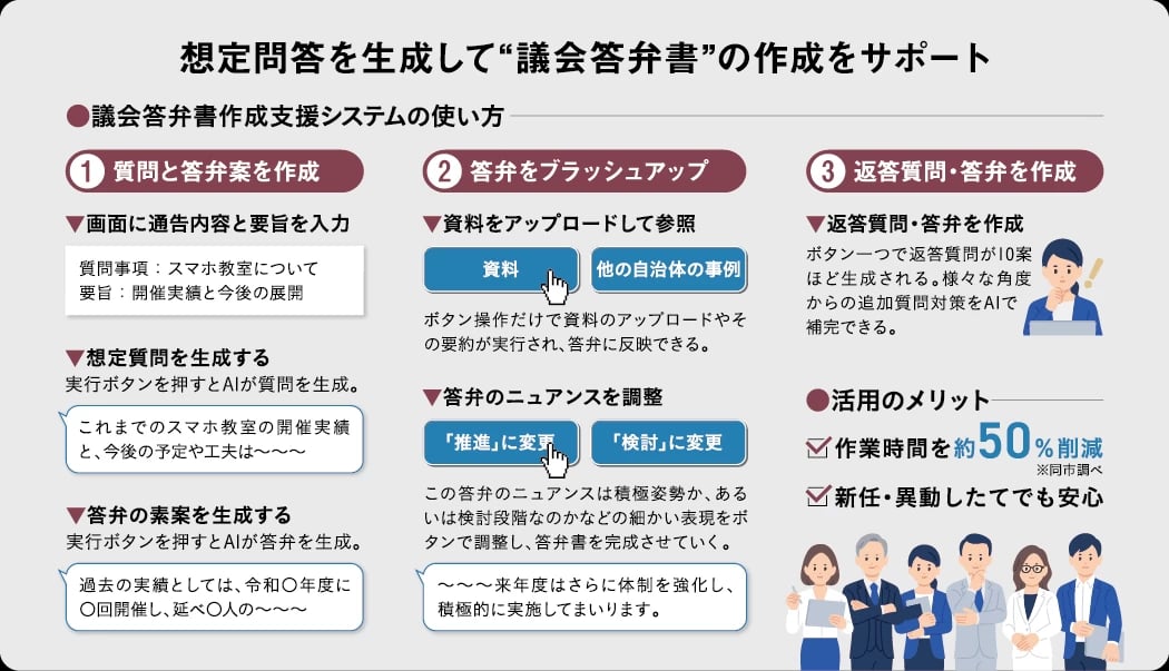 議会だよりと答弁書の作成支援システムは、令和6年の実証実験を経て、翌年に本導入された。期待通り、前者は80%以上の業務効率化を達成。後者も職員から“50%以上の効率化ができた”という反応があったという。「複数案が生成されるので、自分では考えつかない想定問答もできます。議会に出席する際の備えになりますし、結果的に質問されなくても、AIによる問答のアイデア自体が、行政をブラッシュアップさせる一つの情報になる。これも重要な点です」と蛯原さん。