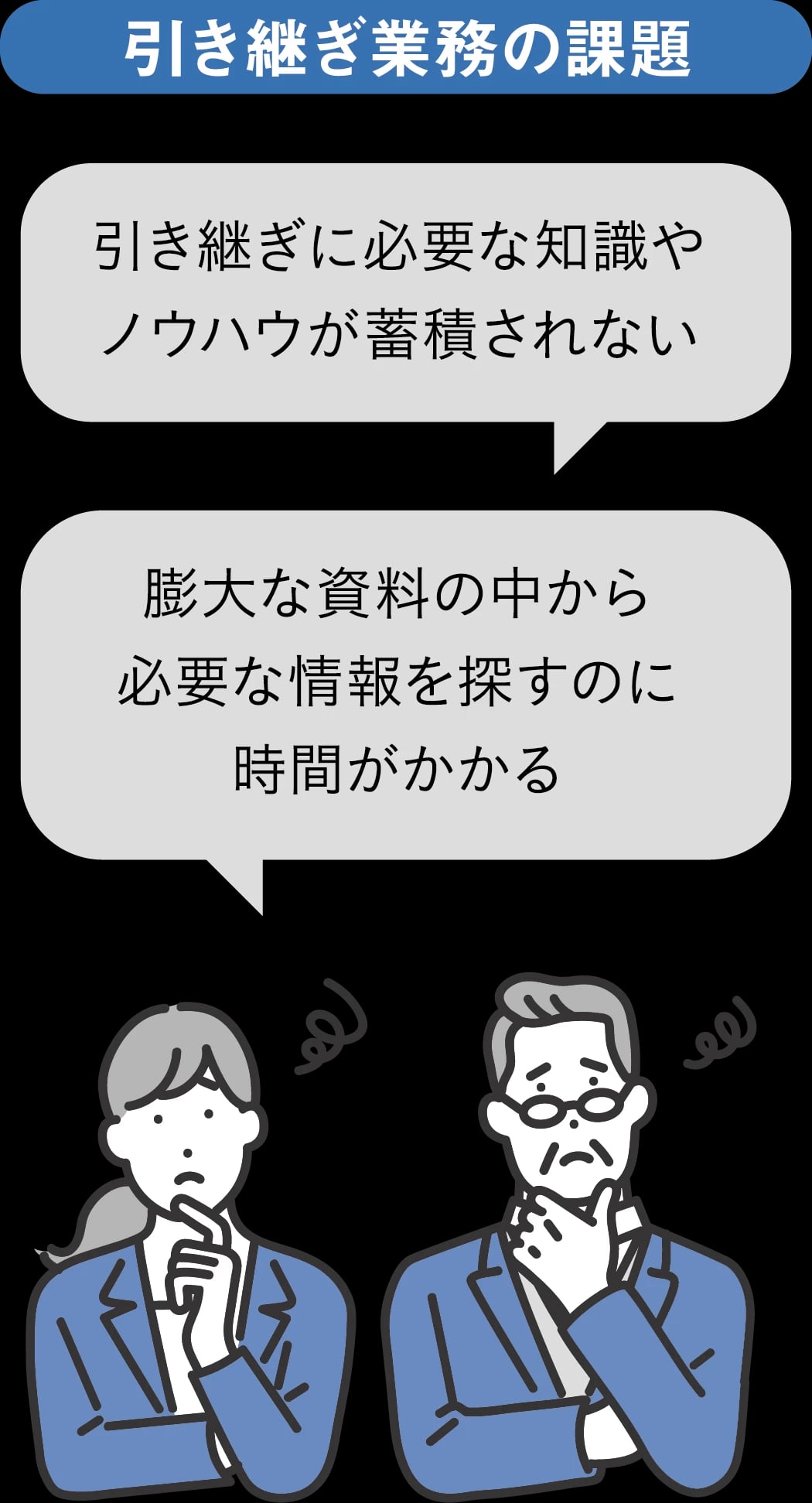 膨大な資料探しを省力化し引き継ぎの不安を和らげる。