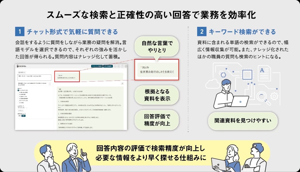 同サービスの軸は、業務に関する質問を画面上で入力すると、格納された資料をもとに回答が生成される“質問回答機能”だ。根拠も併せて表示されるため、内容の確認をスムーズに進められる。また、生成AIが事実とは異なる情報を出力してしまう、いわゆるハルシネーションの対策として、信頼性の高いデータを参照する“RAG(ラグ)機能”を取り入れた。「生成AI向けの命令文であるプロンプトを考える必要はありません。隣の席にいるベテラン職員に話しかけるような気軽さで使ってもらえるよう工夫しました」。質問内容と回答の履歴はナレッジ化して蓄積されるので、同じような疑問をもつ職員の助けになる。