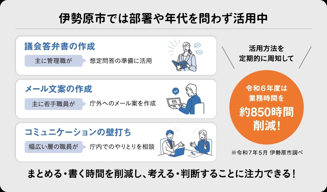 生成AIを日常業務に活用し、全庁で年間約850時間を削減した。