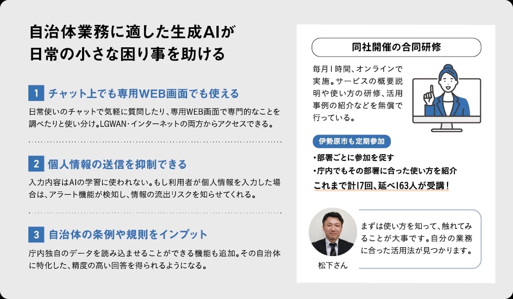 社会全体が注目する生成AIの活用。業務でどのように活かすのか、自治体によって考え方も様々だ。伊勢原市では、チャットツールとWEB画面の両方から使える生成AIサービスを活用。庁内に展開しつつ効果を上げているという。