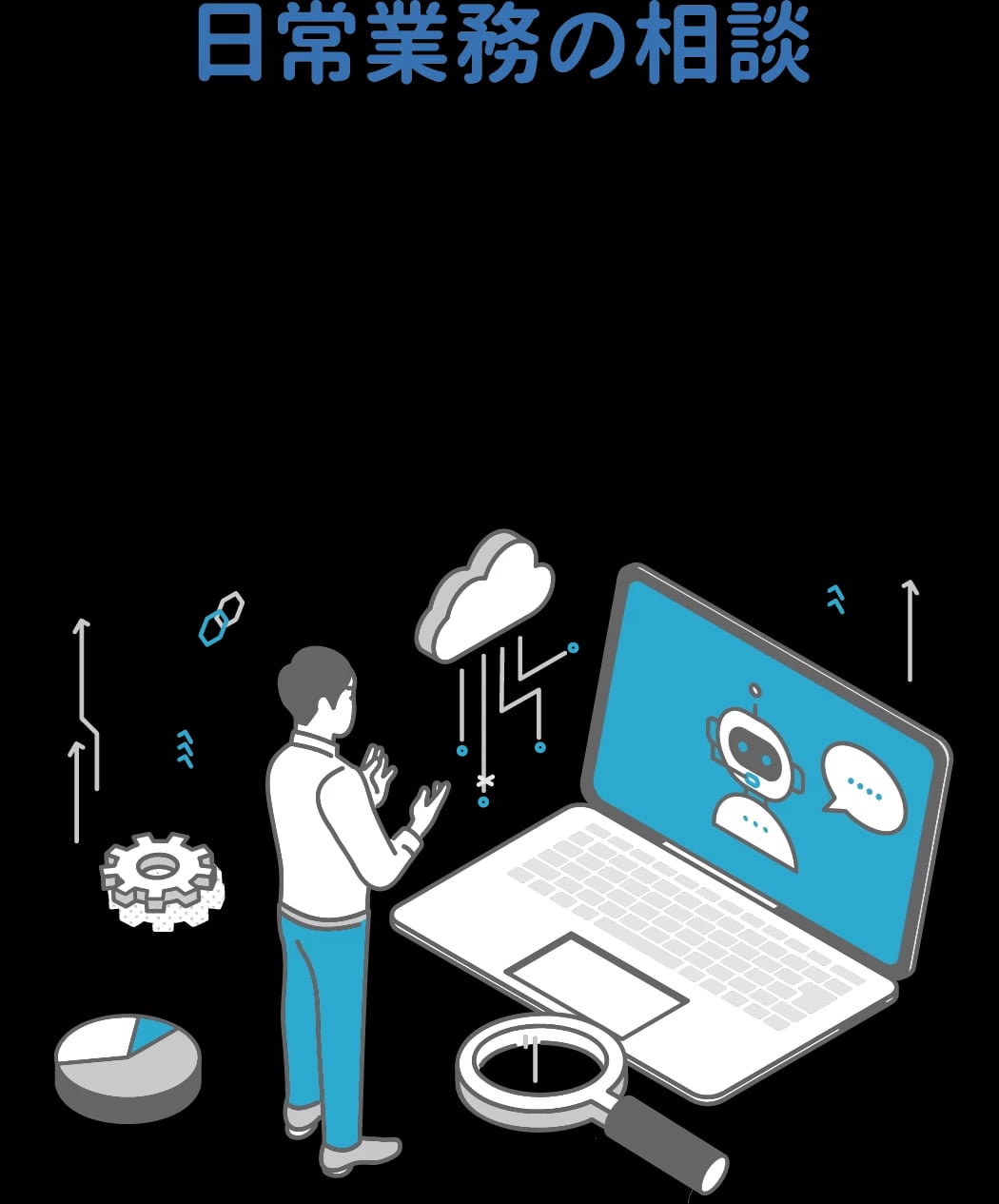 そのためには、起動を習慣化し、身近なツールとして日常に溶け込んでいることが重要です。また、様々な業務の具体例が示されていれば、自分の仕事での使い方がイメージしやすくなる。質問文のテンプレートもあれば、それを参考にしながら試すことができます。本サービスはこれらを備え、職員がやるべき業務に集中できる環境をつくります。職員数が減っても自治体の業務は複雑化していくでしょう。気軽に相談できる相手だと思って、体験してみてください。