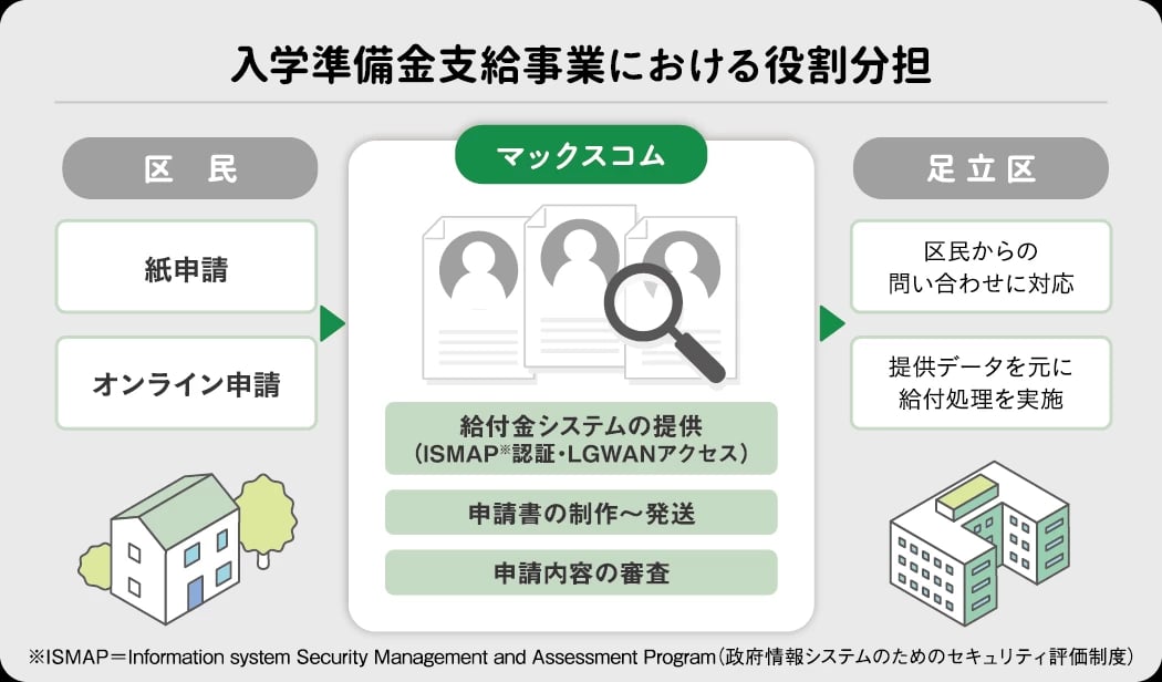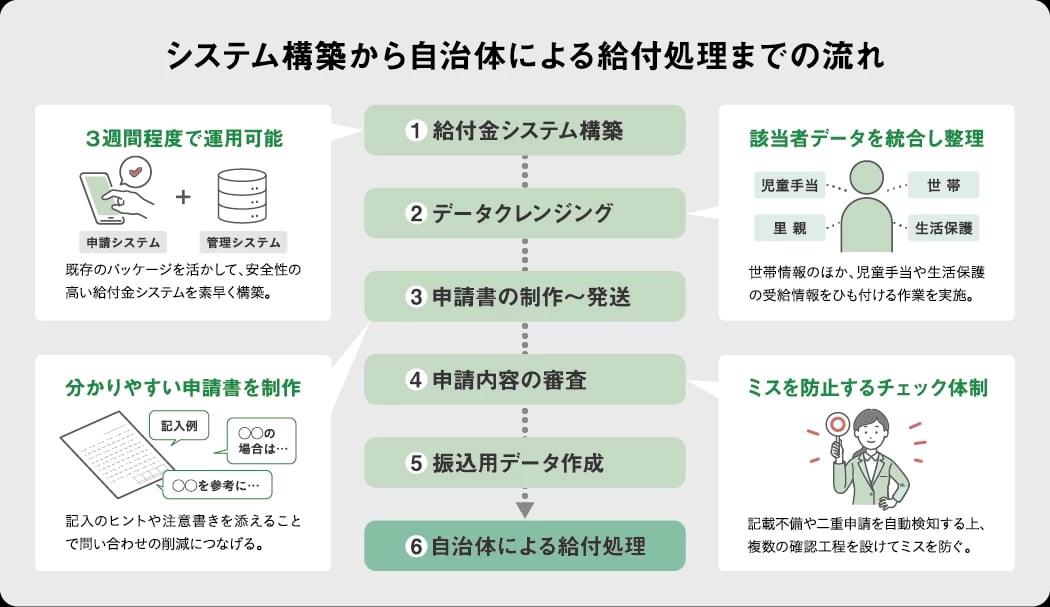 入札を経て、給付金事業で多くの実績をもつ「マックスコム」への委託が決定。同区の住民税非課税世帯給付金事業で実績があったことも信頼につながったという。同社は既存パッケージを活用して、委託決定から3週間程度で給付金システムを構築。該当者データのクレンジングから申請書の制作~発送、システム入力や審査、給付データの作成、未申請者への確認までを一括して対応した。
