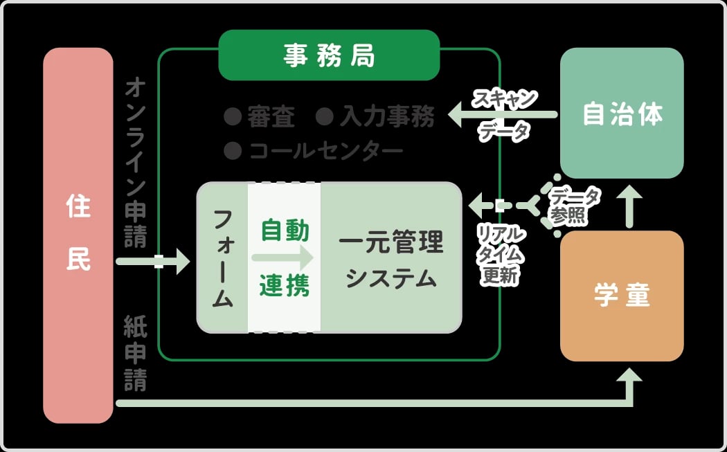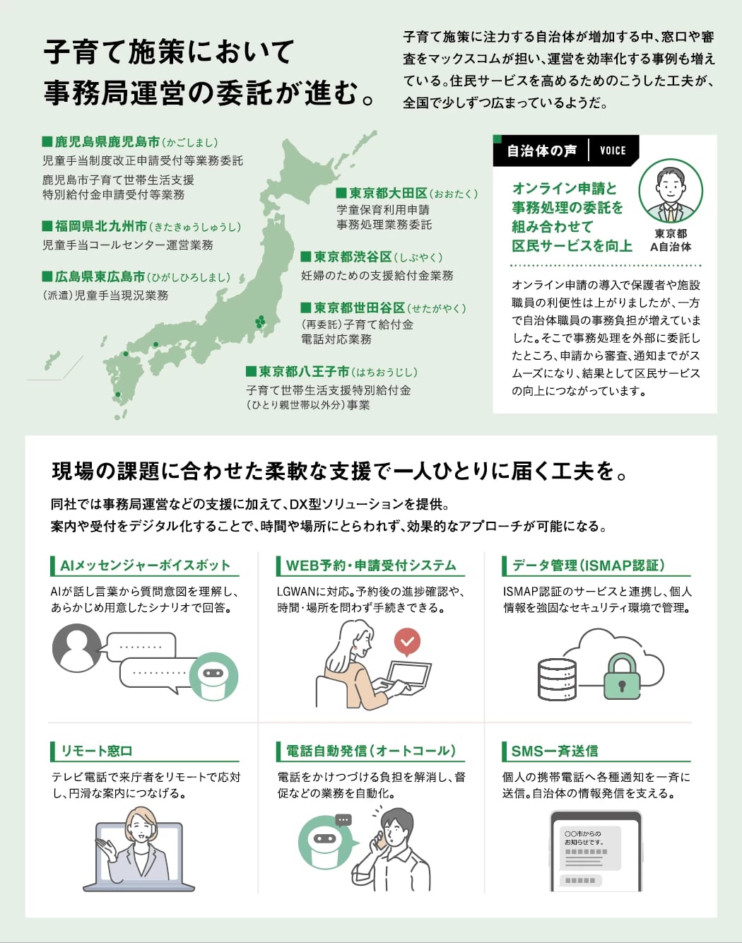 学童保育の現場では、紙の申請が中心で、住民には来所の負担、施設には対応の負担、そして自治体には事務の負担があるという。そこでマックスコムは、オンライン申請と事務局運営を一体化。紙の申請も併用できる多様な窓口を整え、事務を丸ごと代行することで、効率的な運用と子育て環境の向上を支援する。