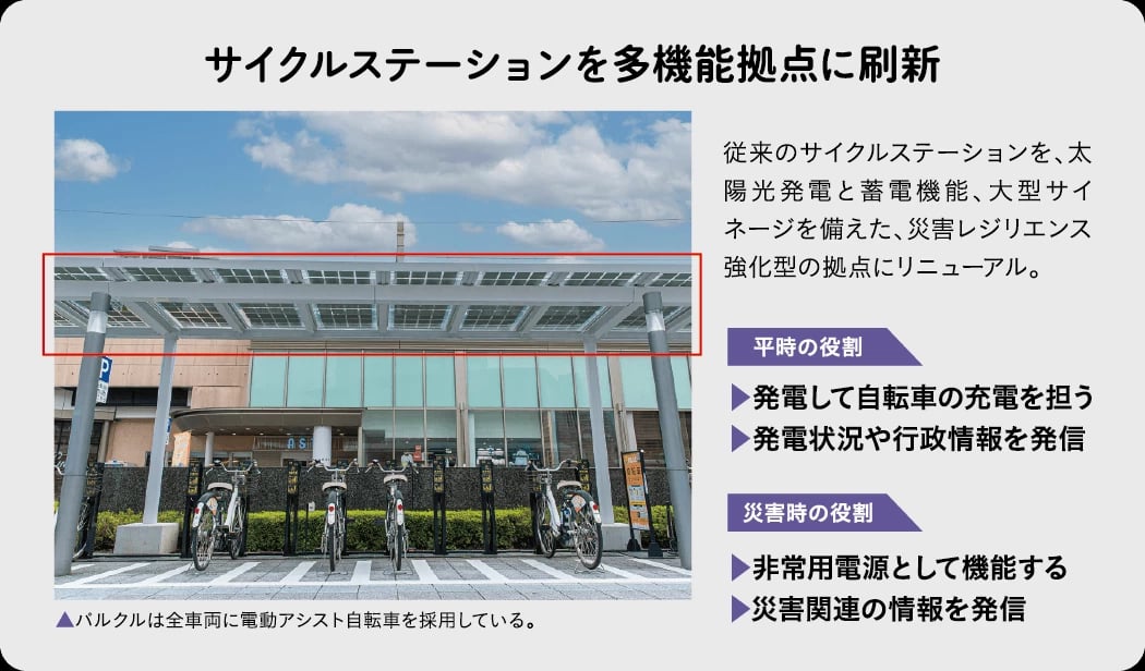 その内容は、太陽光による発電と蓄電ができる仕組みを導入し、生み出した電力を電動アシスト自転車の充電や大型サイネージによる情報発信に活用するというもの。平時の利便性と災害時の備えを両立するのがねらいだ。「令和4年の台風15号では想定を超える被害が生じ、行政の情報発信が後手にまわってしまいました。市民が求める情報を的確に発信する必要性を痛感していたので、タイムリーな提案でしたね」。