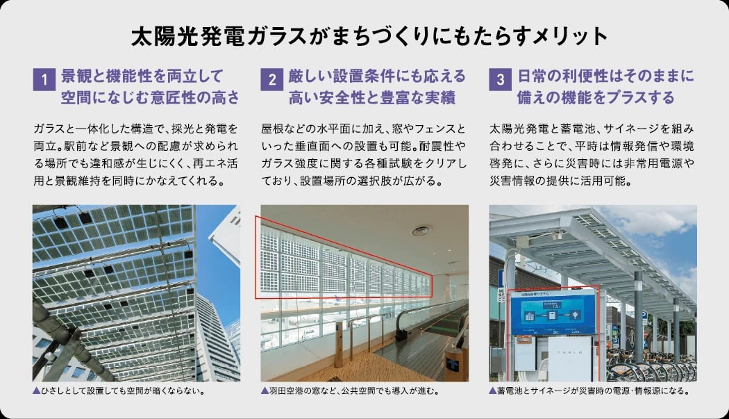 太陽光発電の仕組みに選ばれたのは、総合素材メーカー「AGC(エージーシー)」の建材一体型太陽光発電ガラス「サンジュール®」だ。合わせガラスに発電セルを組み込んだもので、窓や建物のガラス部分に施工可能。耐震性や強度試験などもクリアしている。「駅前は多くの人が行き交う場所です。災害時を想定した場合、安全性の担保は大前提でした。その点、自治体での導入実績も多い製品だったので、安心して検討できました」。