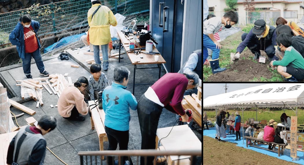 ▲多世代交流などを目的とした複合型コミュニティ「まちのえき」。公園や集会所を活用し、工作教室や農業体験、野菜の移動販売など、拠点ごとに様々な取り組みが行われている。