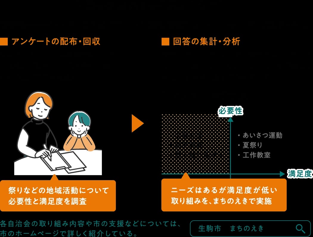 取り組み内容の検討にあたっては、市と自治会が連携し、住民アンケートを実施している。配布と回収は自治会が担い、市は集計・分析を担当する。「アンケートでは、清掃活動や夏祭りなど、地域活動として想定される項目について、必要性と満足度を尋ねています。そうすることで、“住民にとって必要性は高いものの、十分に満足できていない活動”を地域課題として洗い出せます。それを自治会に共有して、まちのえきで優先的に取り組んでもらっています」。