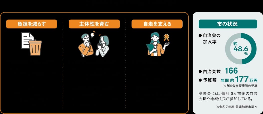 自治会の加入率低下による、役員の担い手不足が課題だった美濃加茂市。座談会の開催や事例集の作成など現場に寄り添う支援に取り組んだ結果、自治会内に前向きな動きが広がり、任期後も関わる人があらわれている。