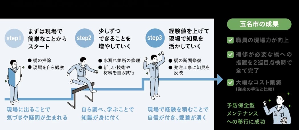 こうして同市では、点検後に措置を行うという一般的な流れを見直し、点検時に職員が直接手当てを行う手法へと転換。そして必要に応じて外部の力も借りながら、予防保全型の橋梁メンテナンスサイクルである「玉名市モデル」を確立した。同取り組みにより、早期に補修が必要と判断された橋梁への措置は、職員の現場力が向上したことで、全て完了。その結果、5年後の点検では、補修を要する橋梁は確認されなかった。また、職員が作業の一部を担うことで、コスト縮減にもつながったという。