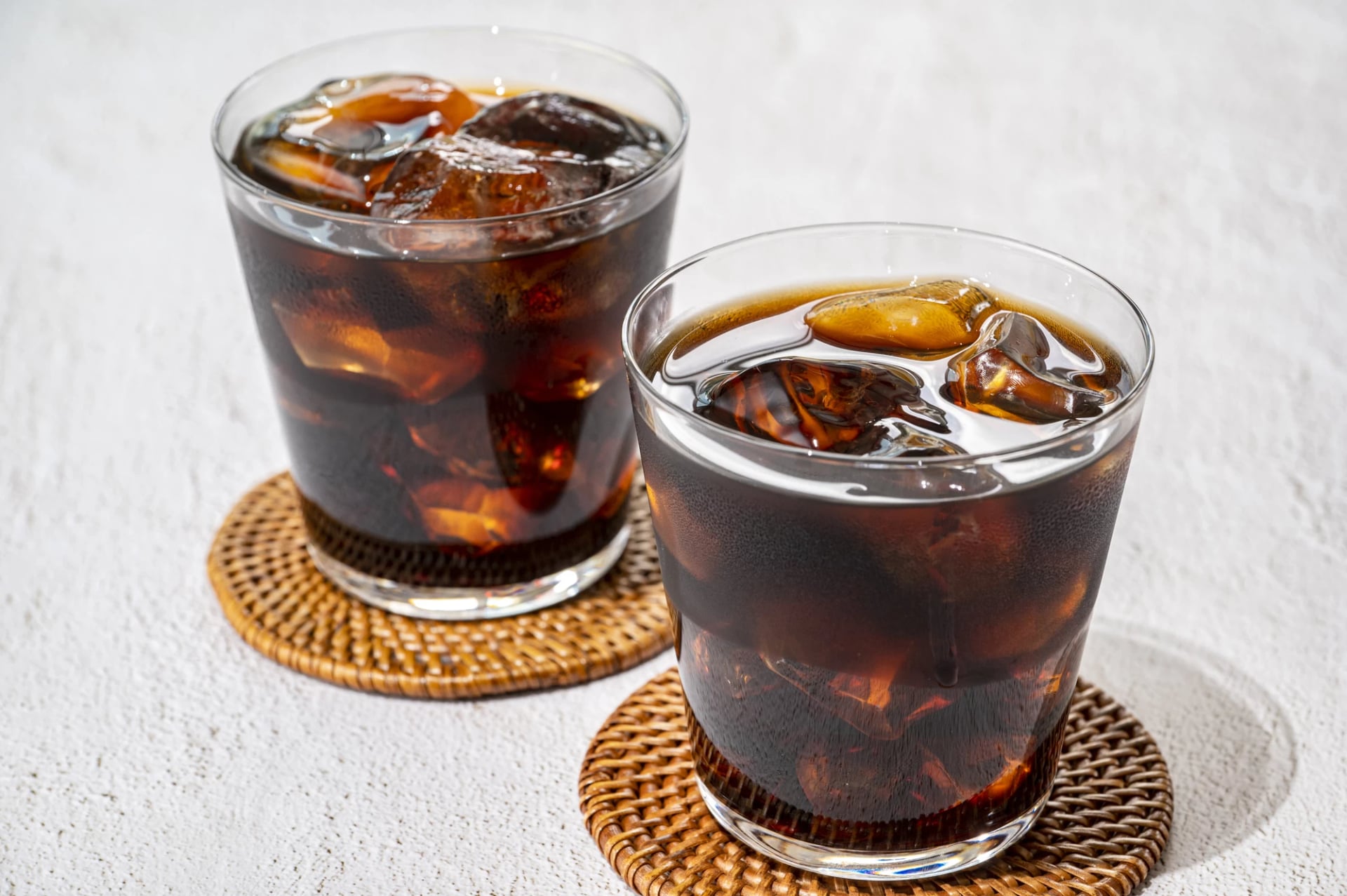 (10)グラスに氷を4-5個入れ、コーヒーを注いで完成。