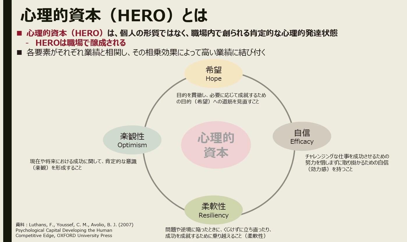 「職員が生き生きと働いている状態」を実現するためには、職員に心理的資本が必要とされます。心理的資本とは、働く人が仕事に対して自信や希望をもち、前向きに困難を乗り越えようとする力のことで、希望、自己効力感、回復力、楽観性の4つから構成されます。