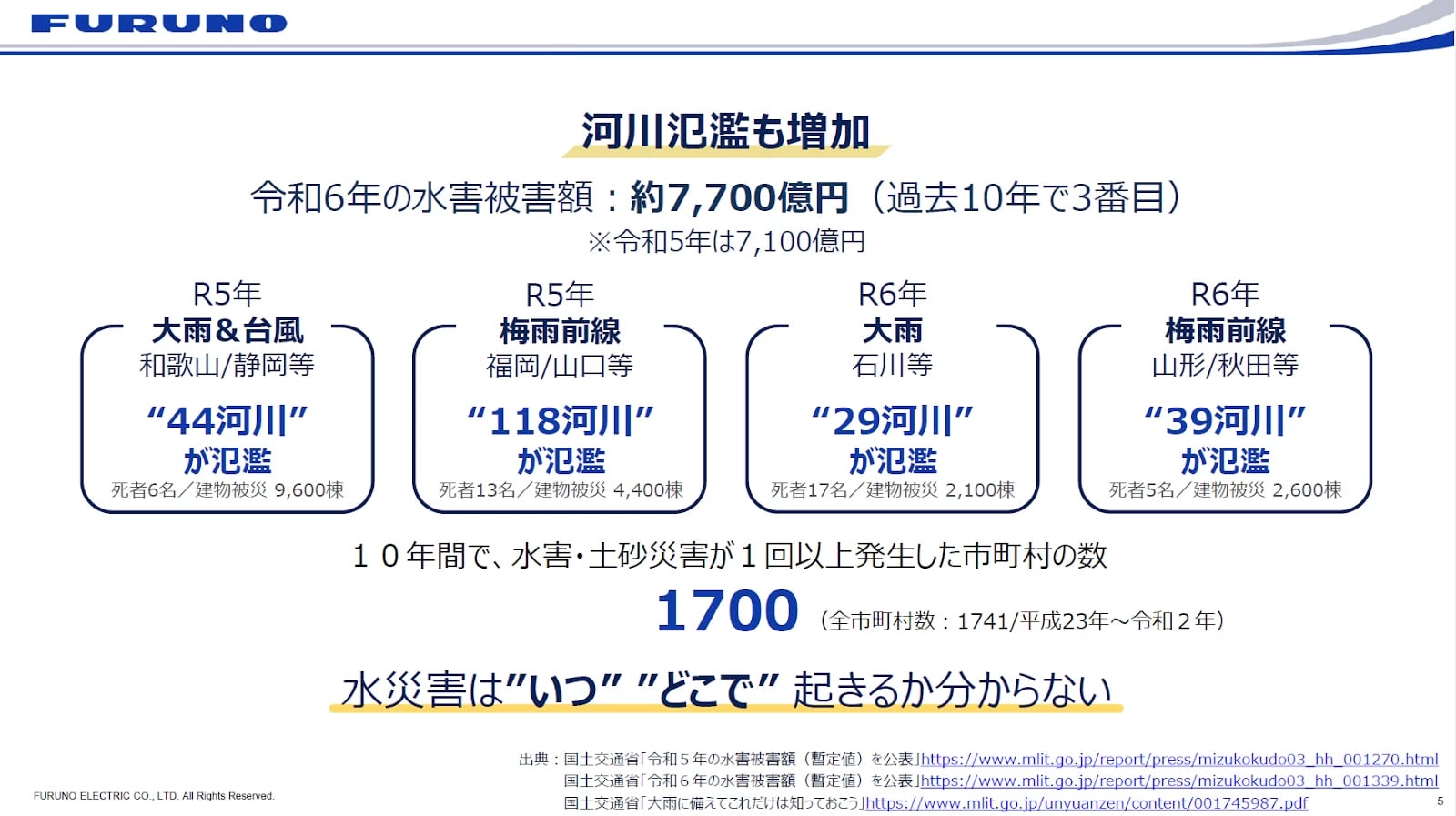 河川に絞って見ても、水害被害額は非常に大きく、近年の河川氾濫では多数の河川で氾濫が発生し、人的被害も出ています。また、過去10年間で水害・土砂災害が1回以上発生した市町村は1700にのぼり、発生していない方が珍しい状況です。つまり、水災害はどこでも起こり得るものであり、「うちは大丈夫」という状況ではないと考えています。