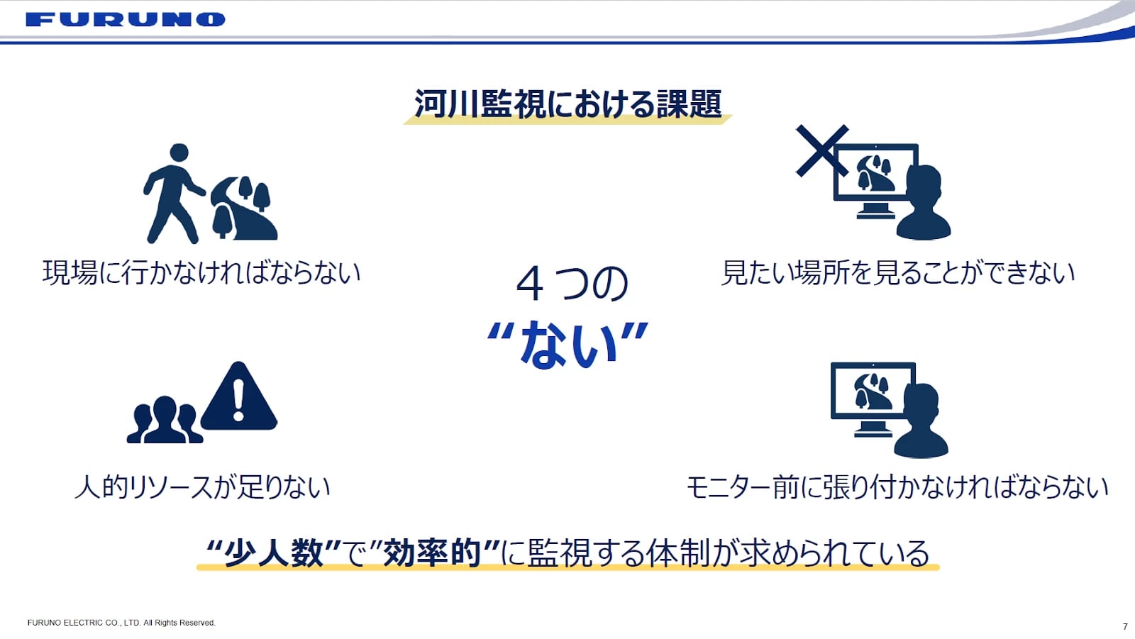 また、現場に行かなければならない、見たい場所を見られない、人的リソースが不足している、モニターに張り付いて監視しなければならない、といった課題もあり、これらを総合すると、少人数で効率的に監視できる体制の構築が求められています。