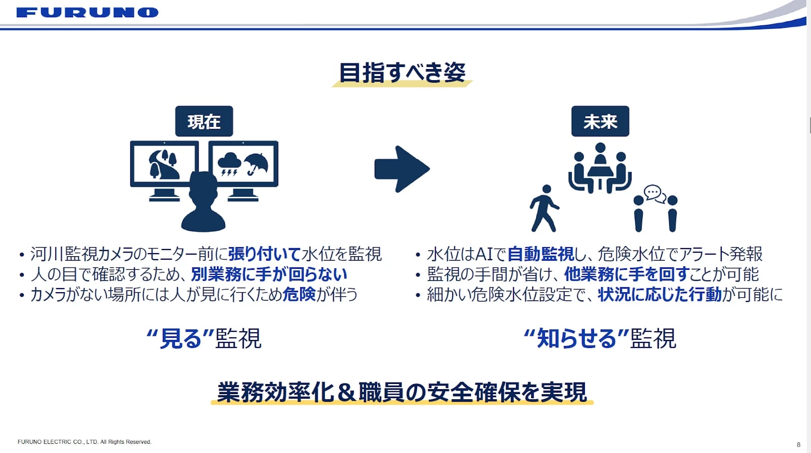 現状は「見る監視」、つまり現地確認やモニター監視が中心ですが、これからは「知らせる監視」へ移行していくことが重要です。水位は自動で監視し、危険水位に達したらアラートが出る仕組みにすることで、職員は他の業務に時間を使えるようになります。また水位ごとにアラートを設定することで、行動判断につなげることが可能になります。