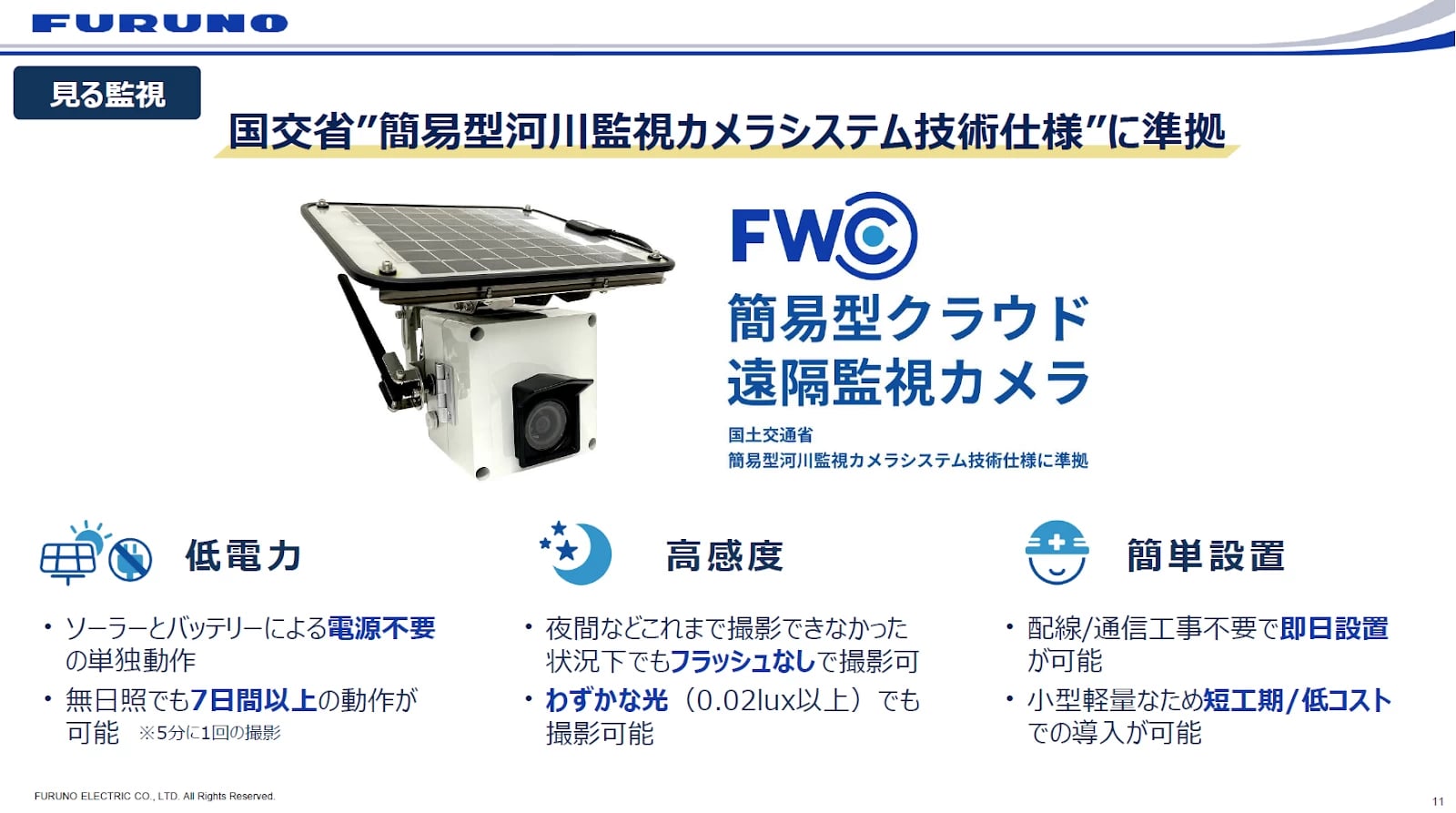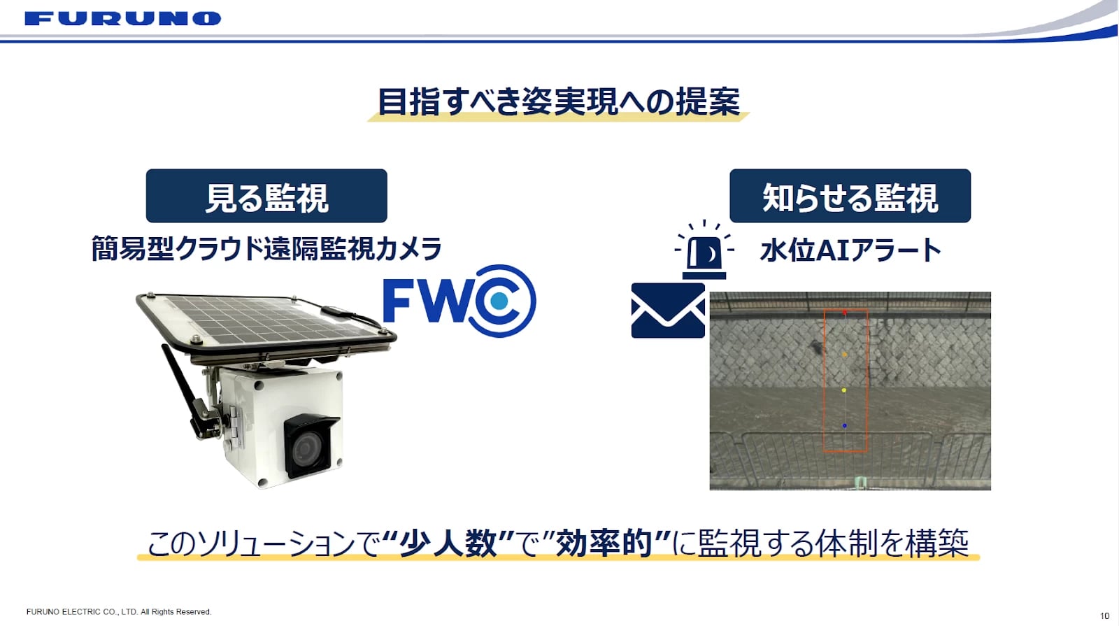 これを実現するために、弊社では2つのソリューションをご提案しています。1つが「見る監視」としての簡易型クラウド遠隔監視カメラ、もう1つが「知らせる監視」としての水位AIアラートです。これにより少人数でも効率的な監視体制が構築できます。