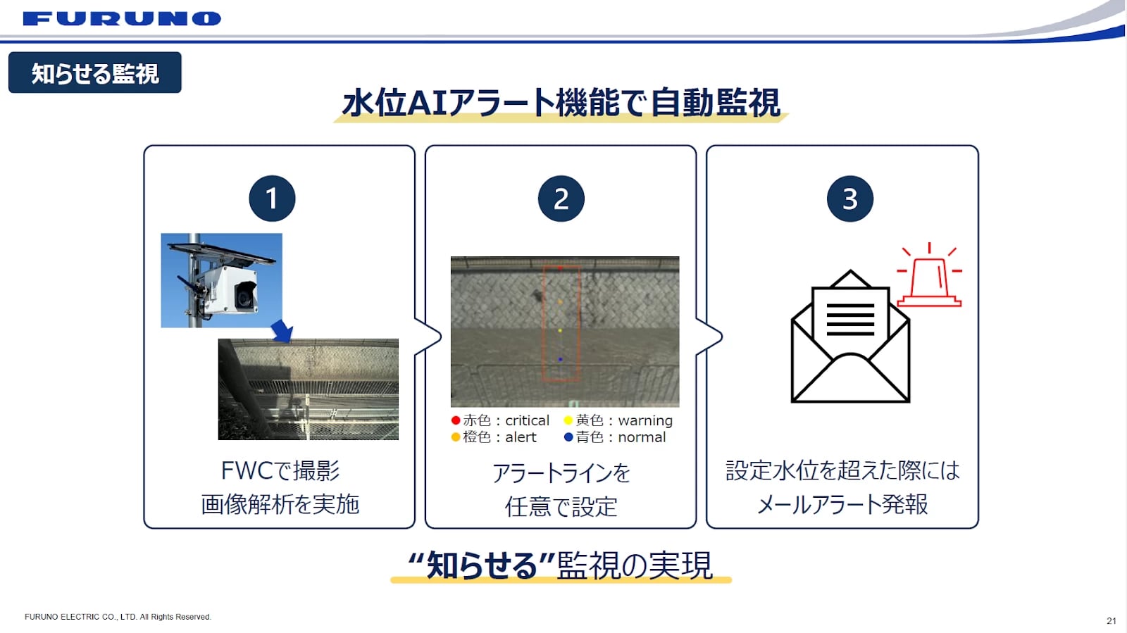 次に水位AIアラートです。カメラ画像を解析し、任意で設定したラインを超えるとメールで通知されます。これによりモニター監視が不要となり、「知らせる監視」が実現します。
