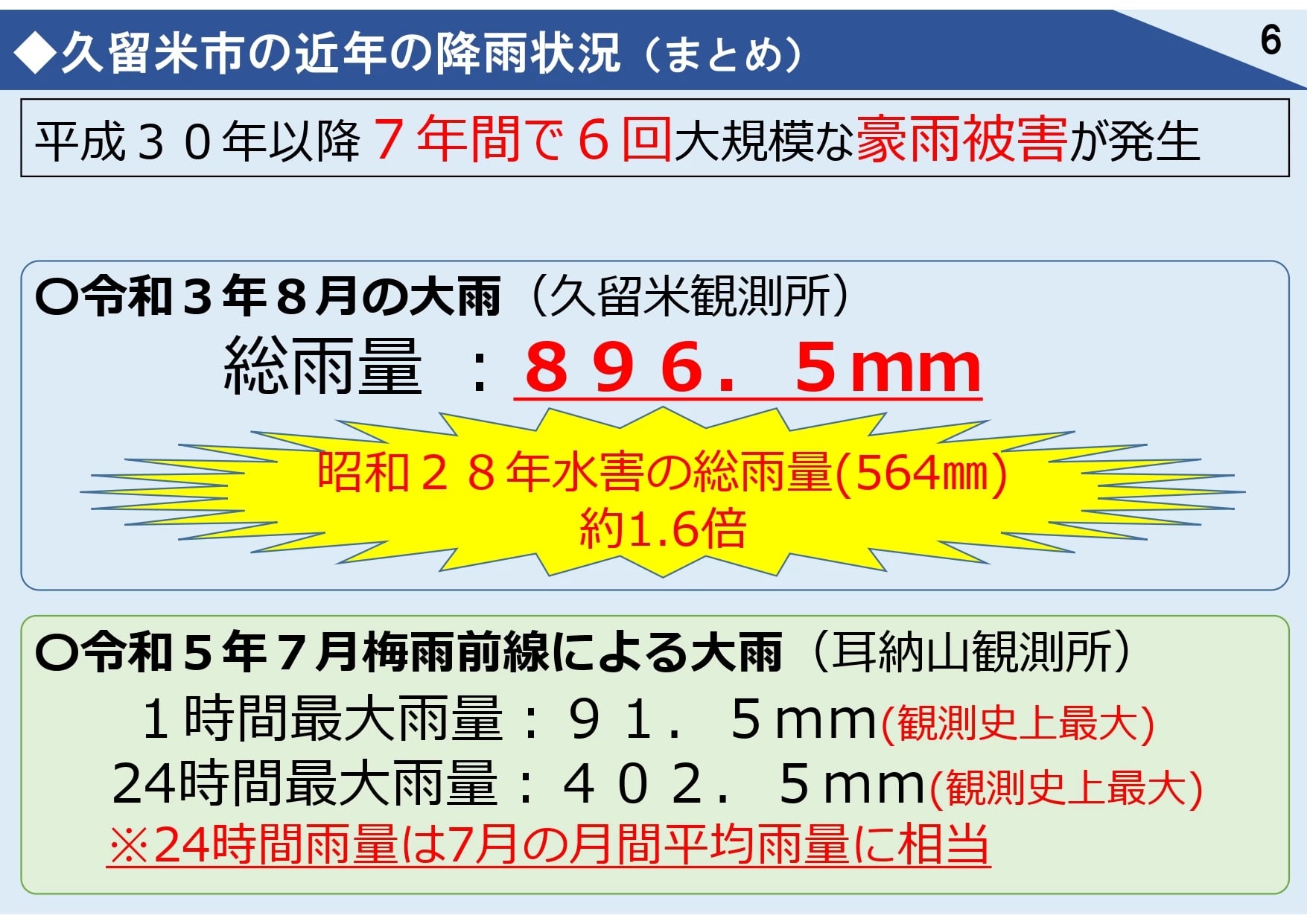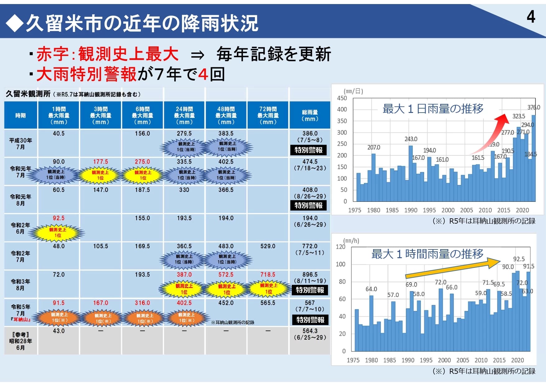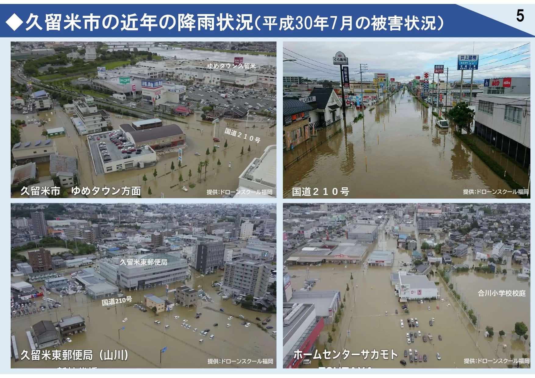 平成30年7月の大雨では、市東部の市街地で広範囲に浸水が発生しました。この地域はインターチェンジを中心に開発が進んできたエリアですが、このように近年は市内各地で内水氾濫による被害が発生しています。令和3年8月の大雨では総雨量896ミリを記録し、これは昭和28年の筑後川氾濫時の約1.6倍に相当します。また令和5年7月の大雨では、1時間雨量91.5ミリ、24時間雨量402.5ミリと、1日で月間平均雨量に匹敵する雨が降りました。